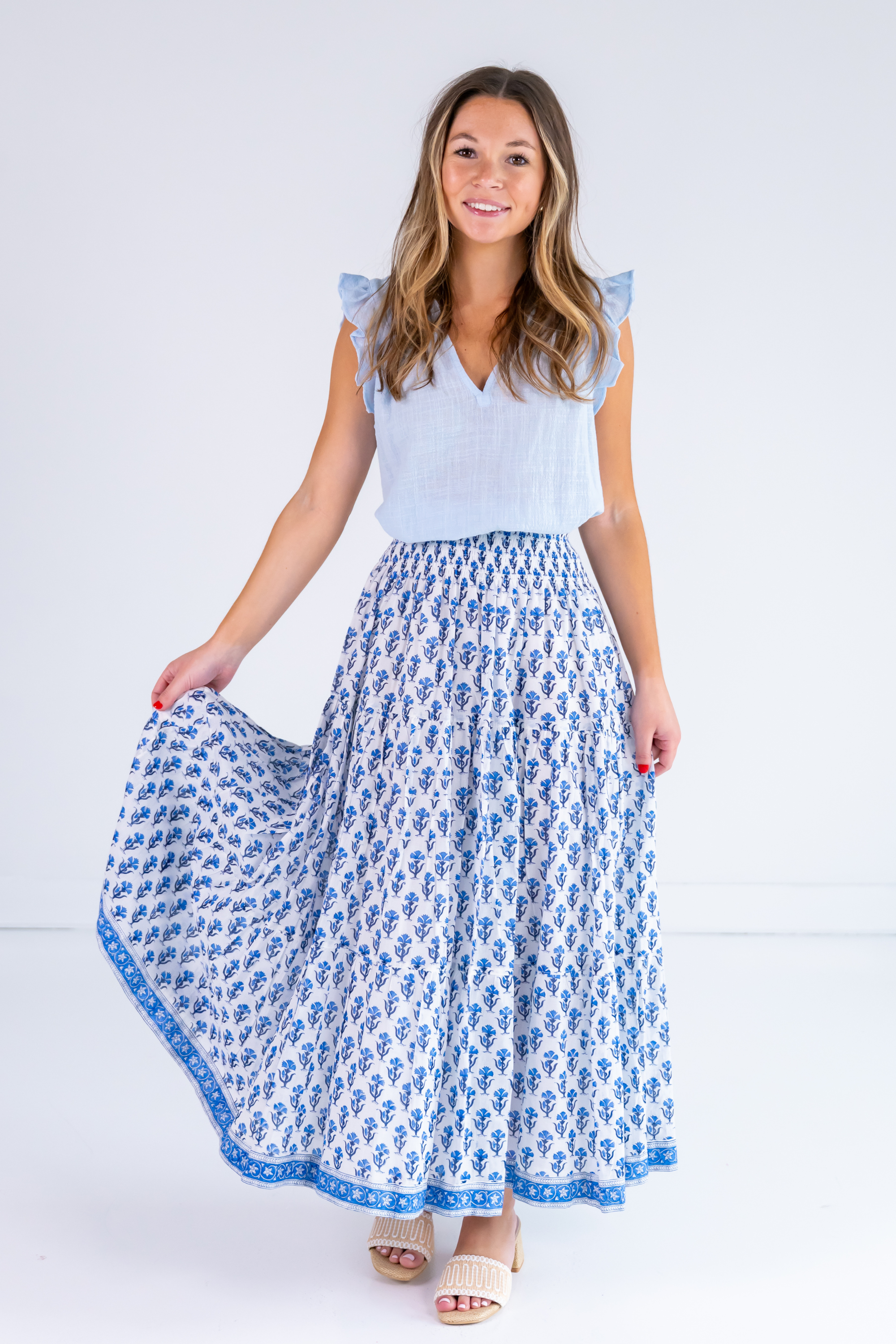 Lucy Smocked Maxi Skirt - Mini Stripe Floral Light Blue