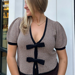 This charming short sleeve cardigan features classic snap buttons adorned with adorable bow details, adding a playful touch to your outfit. Its soft, neutral sea salt color pairs effortlessly with any look, making it perfect for everyday wear with a hint of fun flair.