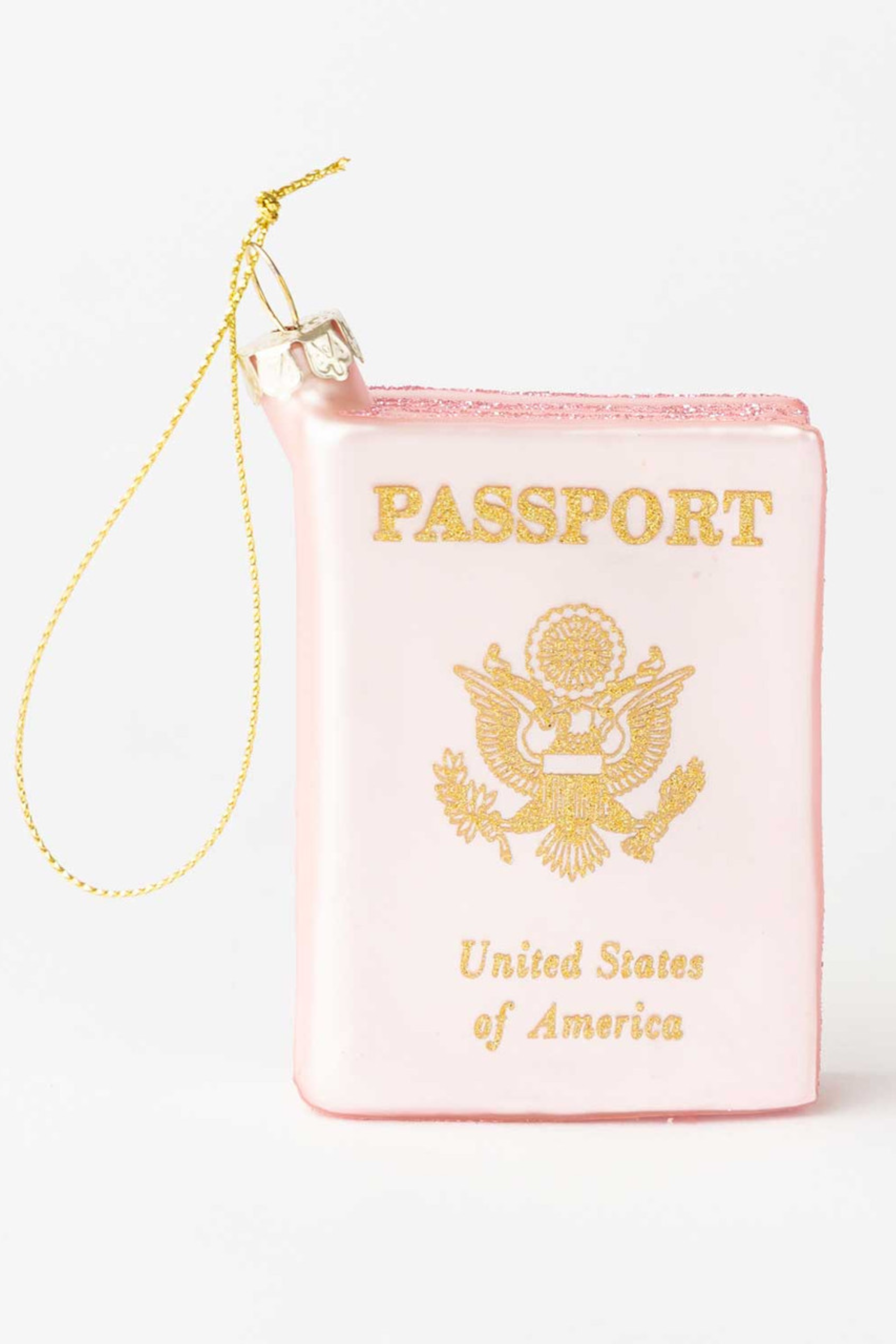 Bring wanderlust to your holiday décor with our hand-painted glass ornament shaped like a classic passport book. Finished in a soft pink hue with charming detail, this ornament celebrates the spirit of adventure and travel, making it a unique and playful addition to any tree. Complete with a metallic string for easy hanging, it's perfect for globetrotters, travel enthusiasts, or anyone who loves to dream of far-off destinations. A whimsical keepsake, this ornament adds a touch of personality and style to your holiday celebrations year after year.