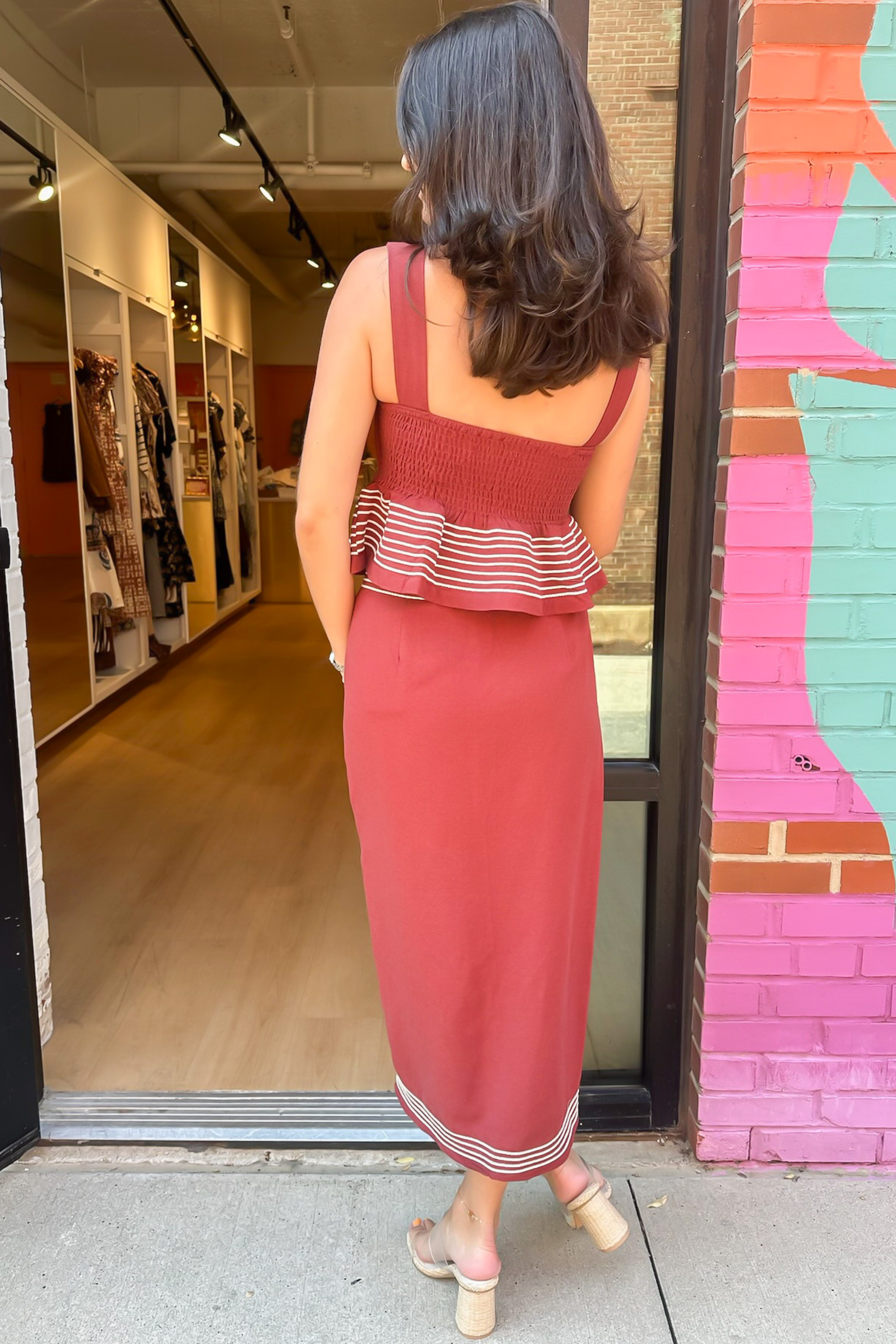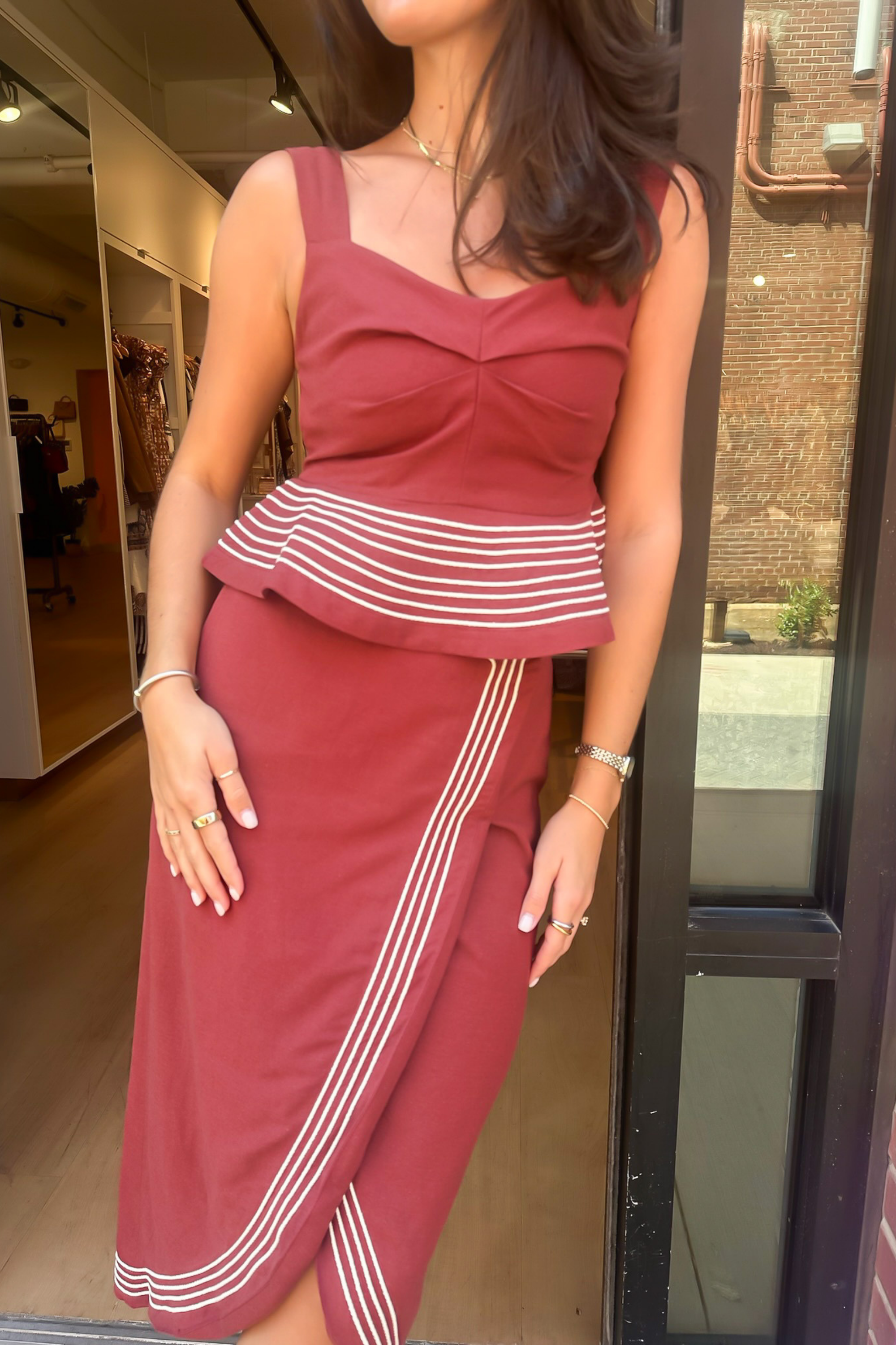 This Barcelona Embroidered Peplum Top in Fig adds a playful touch to any outfit. Its flattering peplum silhouette pairs perfectly with denim for a casual vibe or matches beautifully with the Dublin midi skirt to create a fun, coordinated set. Brighten up your wardrobe with this versatile and stylish top.