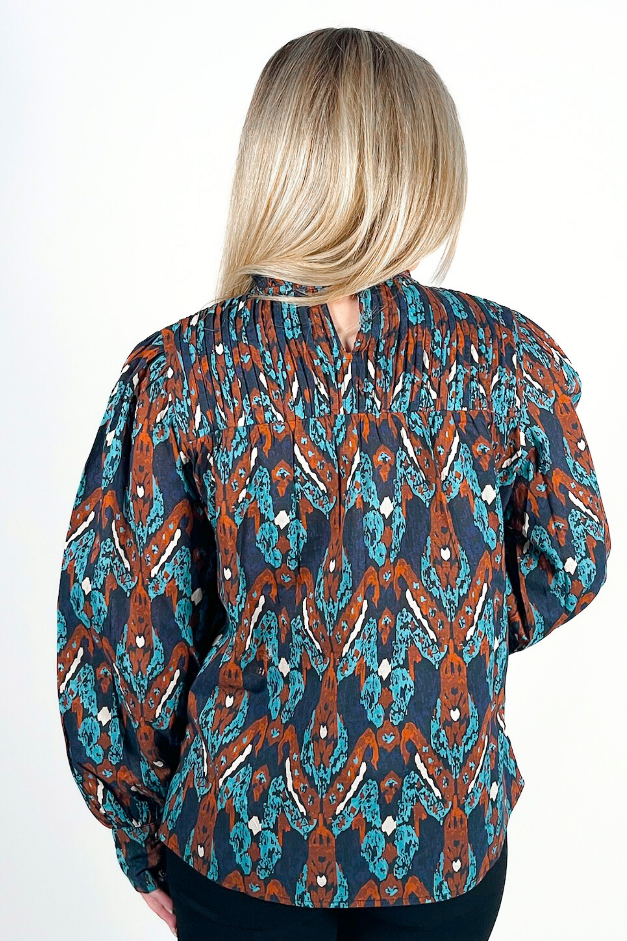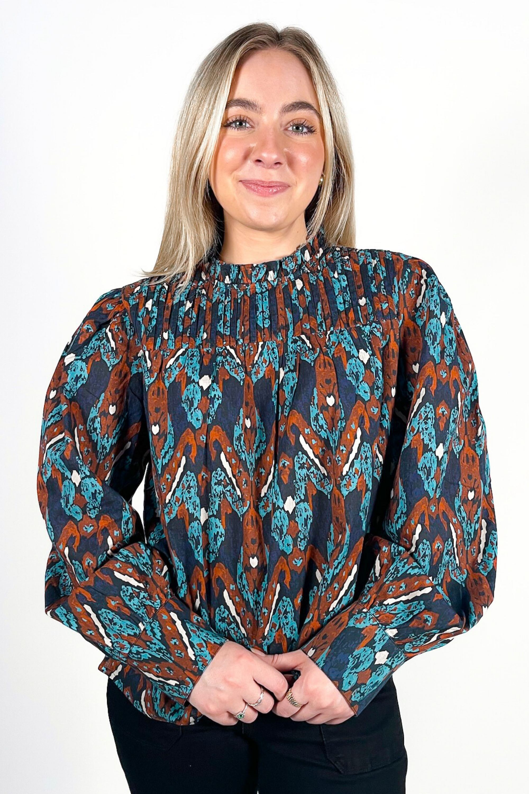 The Malia Top by Bindu has elegant long puff sleeves in a beautiful fall color palette. The pleated collar with a chic frill touch on the neckline makes it feminine and fun. This top pairs best with dark denim for a great, classic fall look!