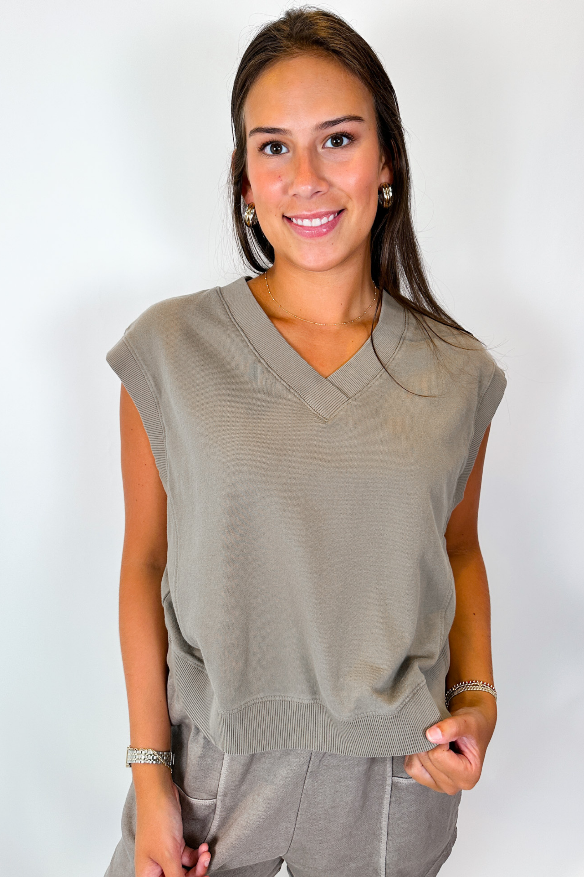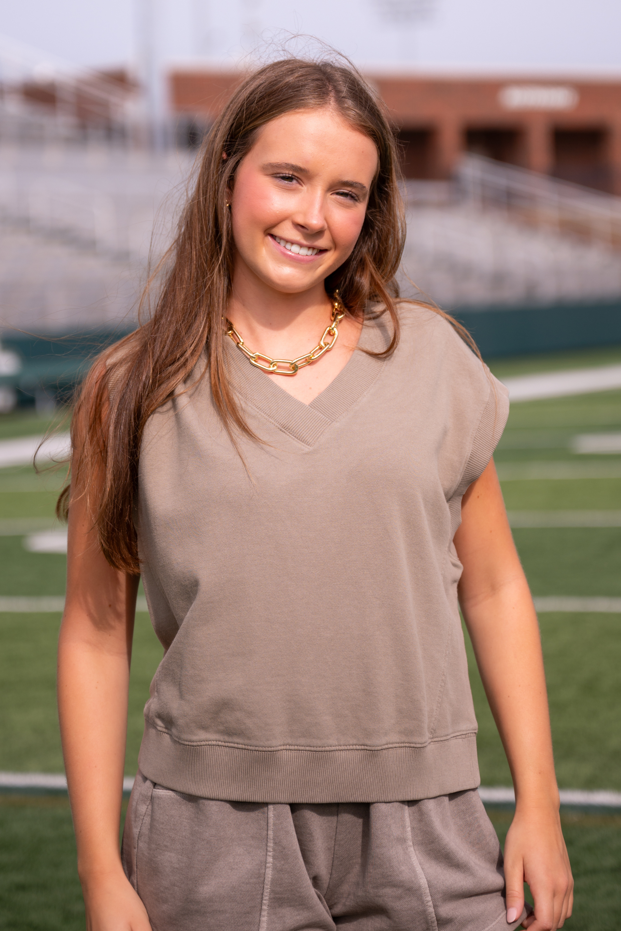 This Ella Cropped V-neck Vest in Mocha Mousse is your new go-to for effortless style. Featuring a flattering wide short sleeve and a chic V-neck cut, it pairs perfectly with matching sets for a coordinated look. Its cropped length adds a playful touch, making it ideal for mixing and matching with your favorite bottoms.