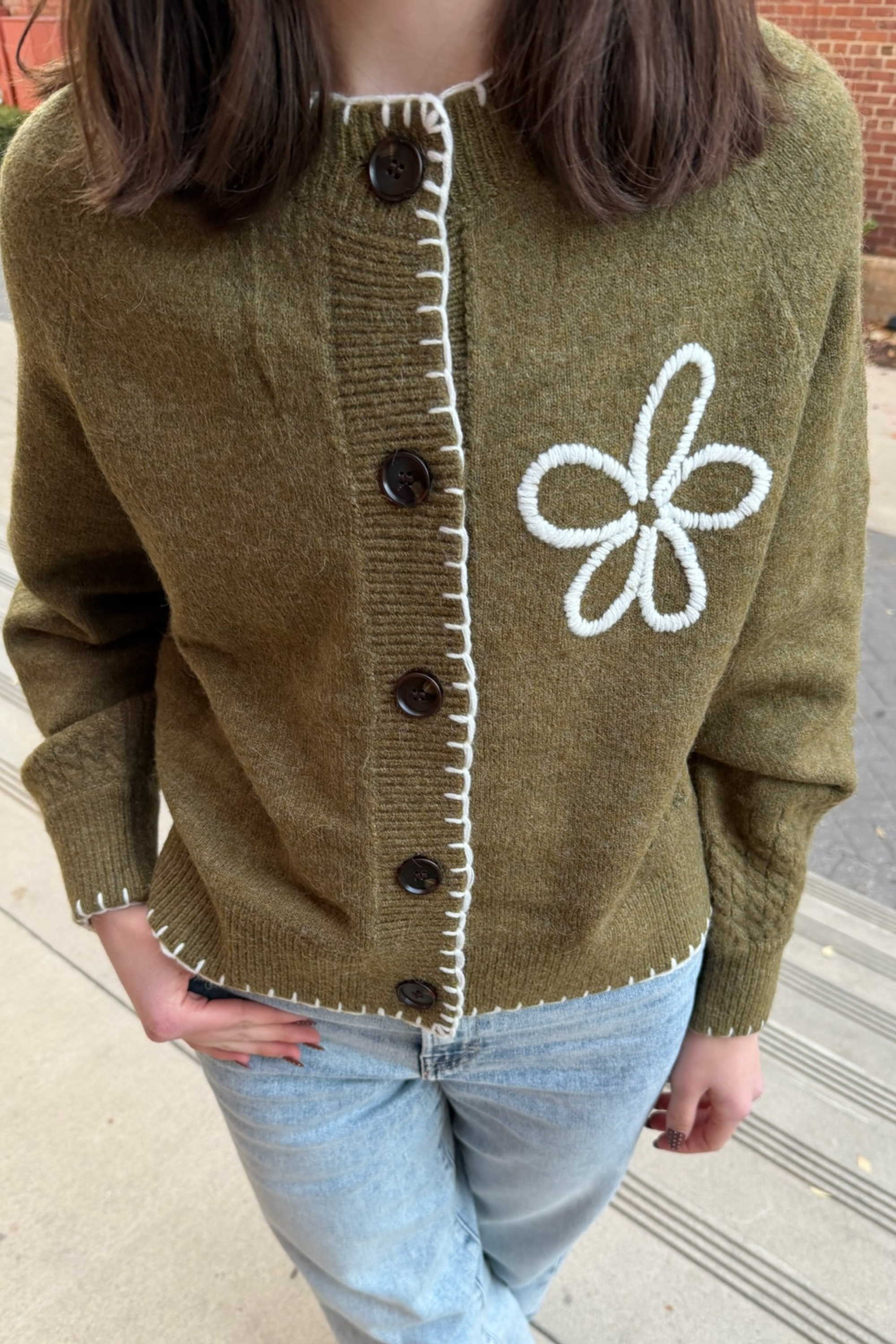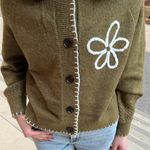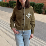 This cozy-cute essential features an abstract flower design that brings a playful touch to your everyday wardrobe. Perfect for layering over your favorite tees or dresses, the soft khaki hue pairs effortlessly with any outfit. Whether you're heading out for coffee or settling in for a relaxed day at home, this cardigan delivers comfort without compromising on style.