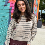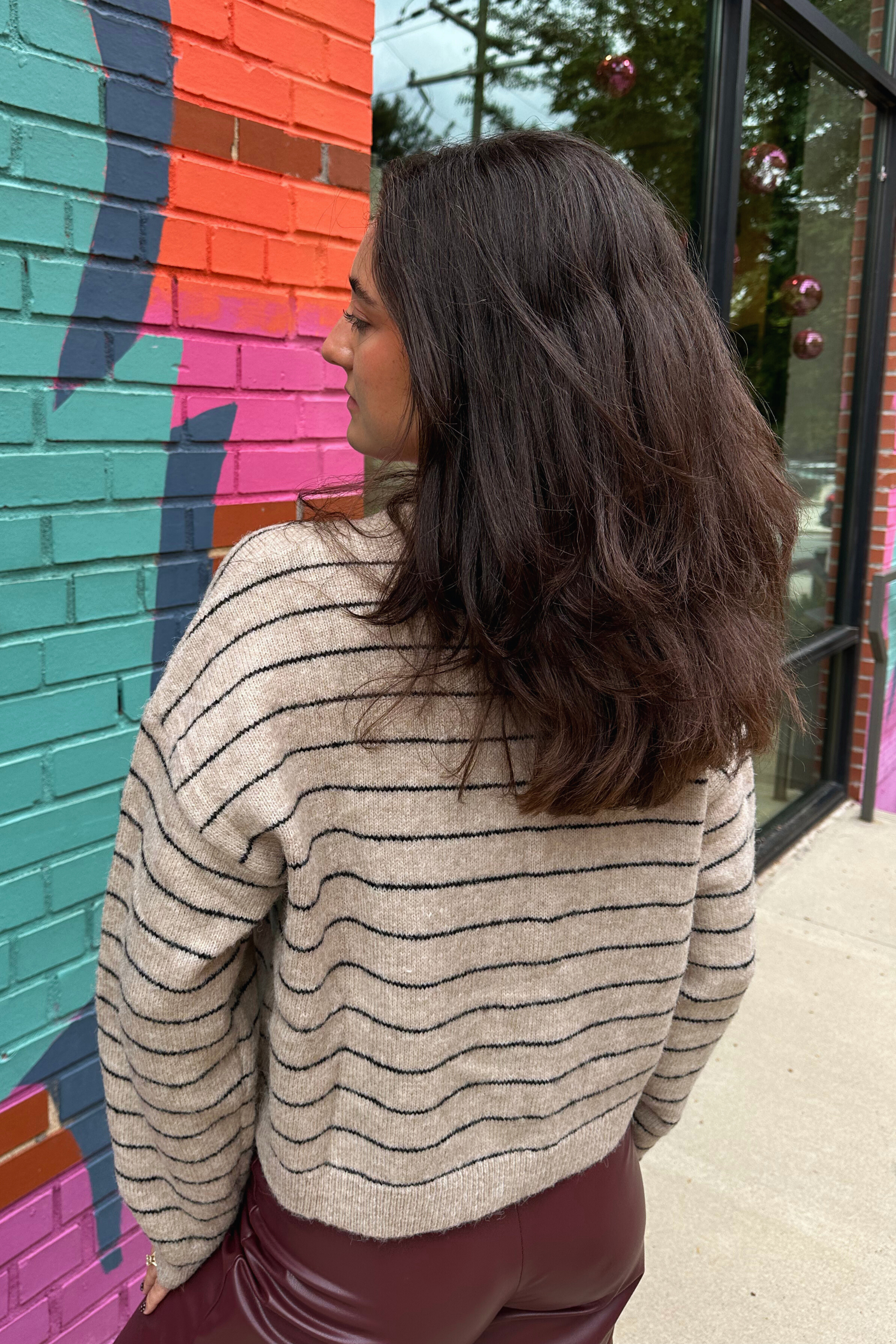 Cozy up in the Jackie Striped Sweater in oat, featuring soft taupe stripes that add a subtle touch of style. This fuzzy, fun sweater pairs perfectly with dark jeans for an effortlessly chic office look that keeps you comfortable all day.