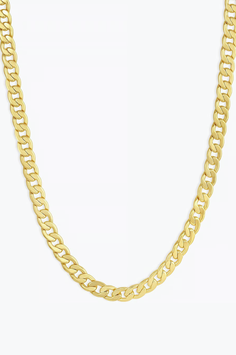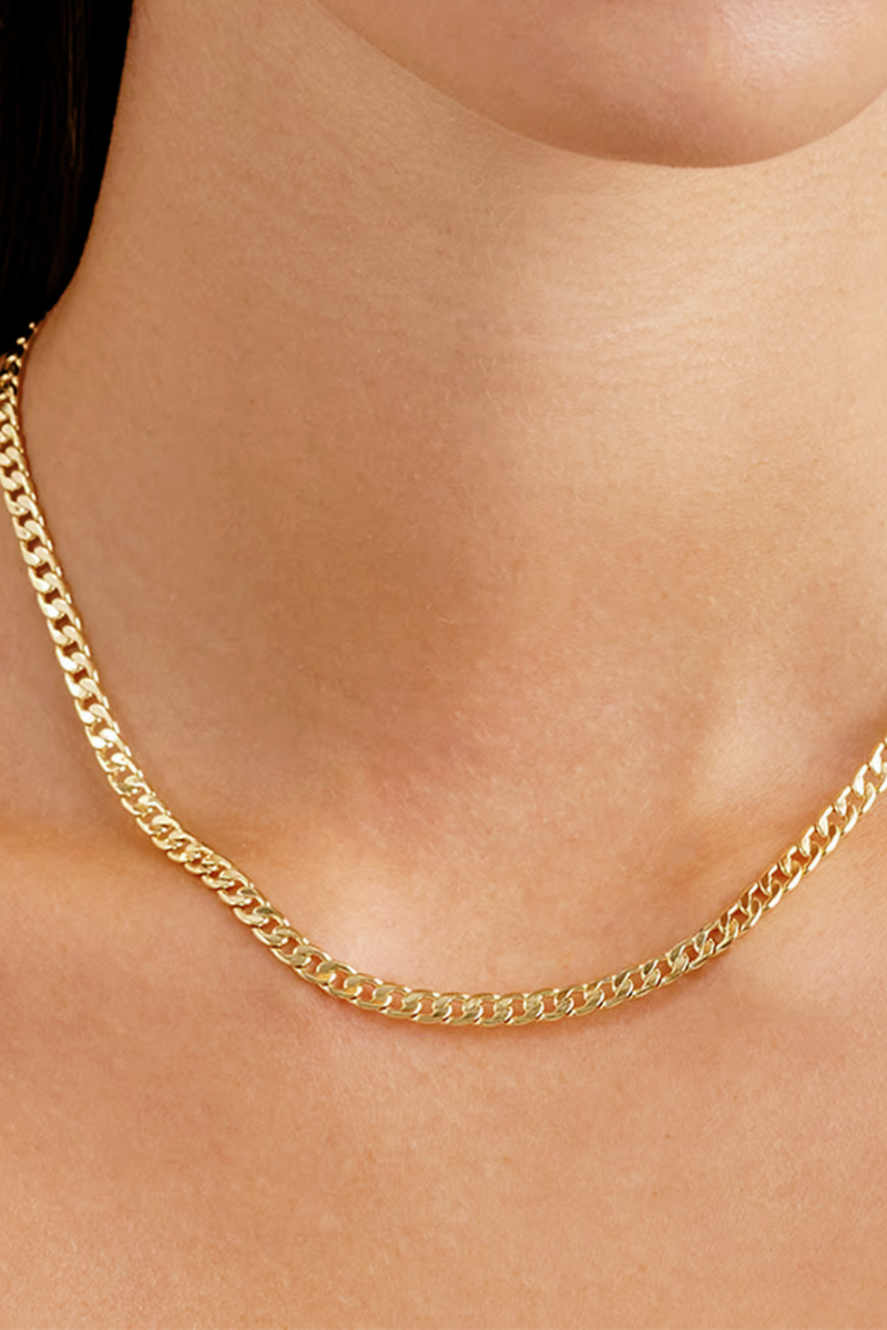 Make a statement in a cool, gold plated 16" curb chain necklace. Perfect alone or layered with your favorite gold chains.