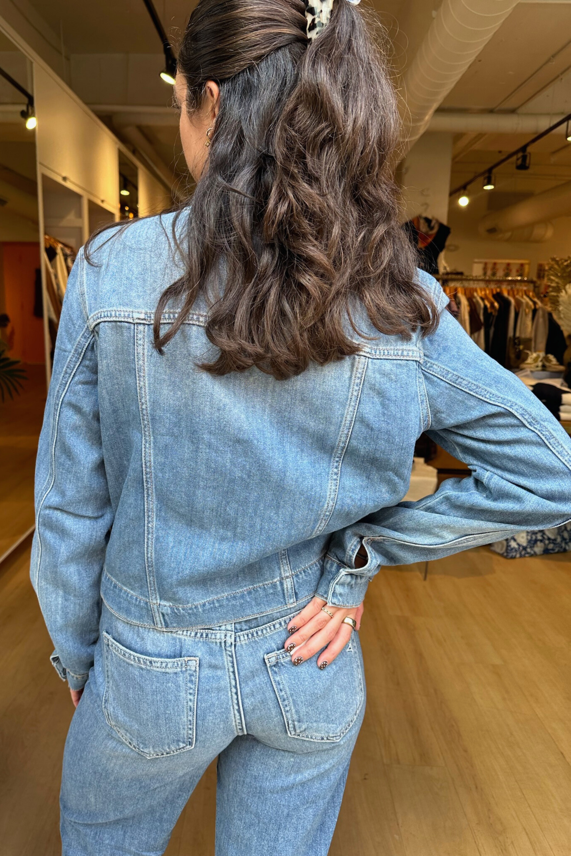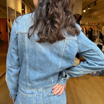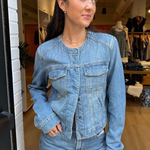 The Sophia Trucker Jacket - Medium Light is your new go-to for versatile style. With a collarless, sleek design and a great fitted cut, it effortlessly doubles as a jacket or a shirt. Perfect for layering or wearing solo, it adds a fun, fresh vibe to any outfit while keeping you comfortably chic all day long.