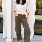 These rich olive corduroy pants bring cozy vibes with their wide barrel-style legs that add a fun twist. Pairs perfectly with a crisp white tee for an easy, casual look or layered with a sweater for extra warmth and style. Comfortable and effortlessly cool, they’re a must-have for a laid-back, chic wardrobe.