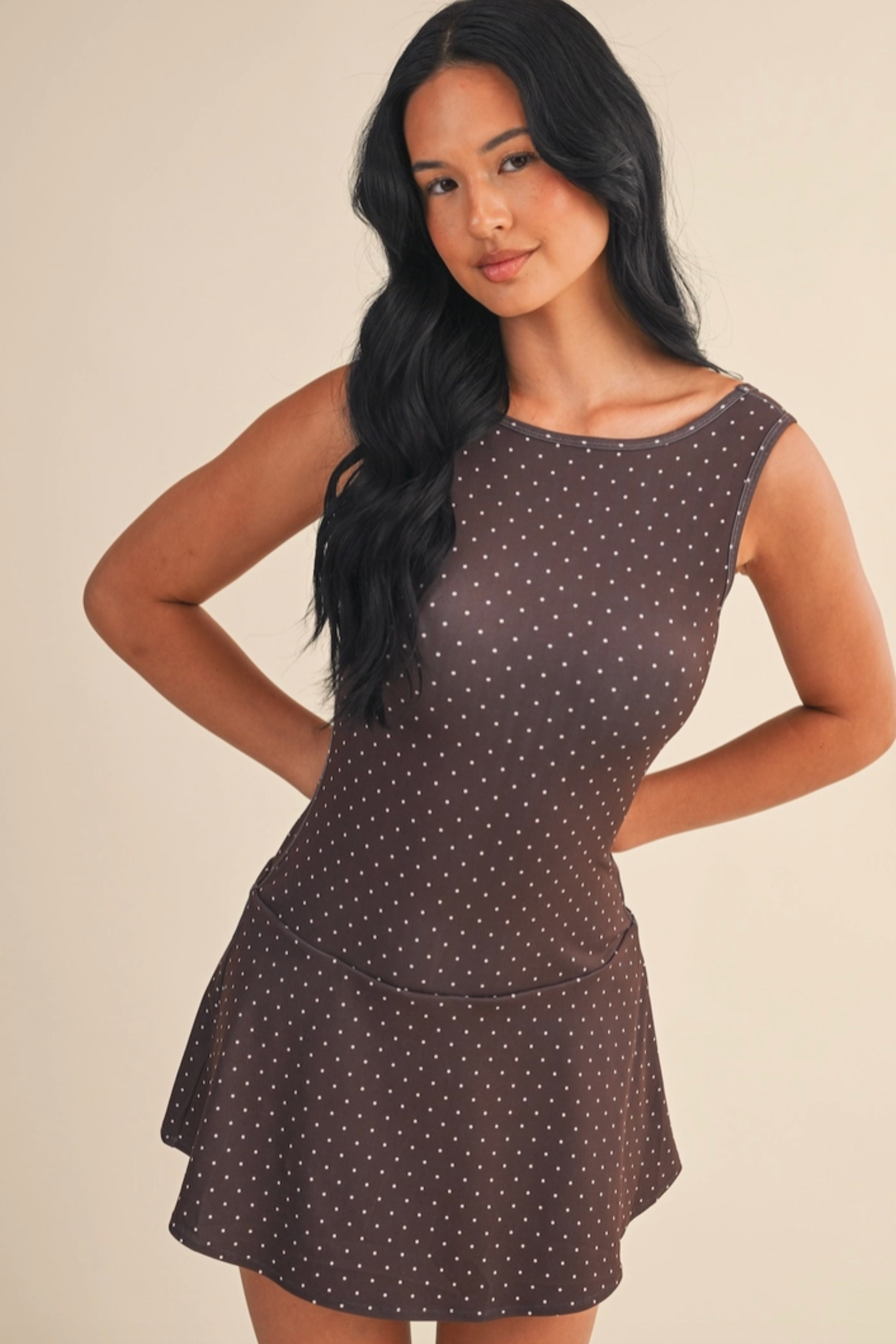Meet your new favorite active dress—playful and perfect for on-the-go days. The Penny Polkadot Dropwaist Athletic Dress features a trendy brown polka dot pattern and a flattering drop waist design that moves with you. Whether you're running errands or catching up with friends, its sporty yet chic vibe keeps you comfortable and stylish all day long.