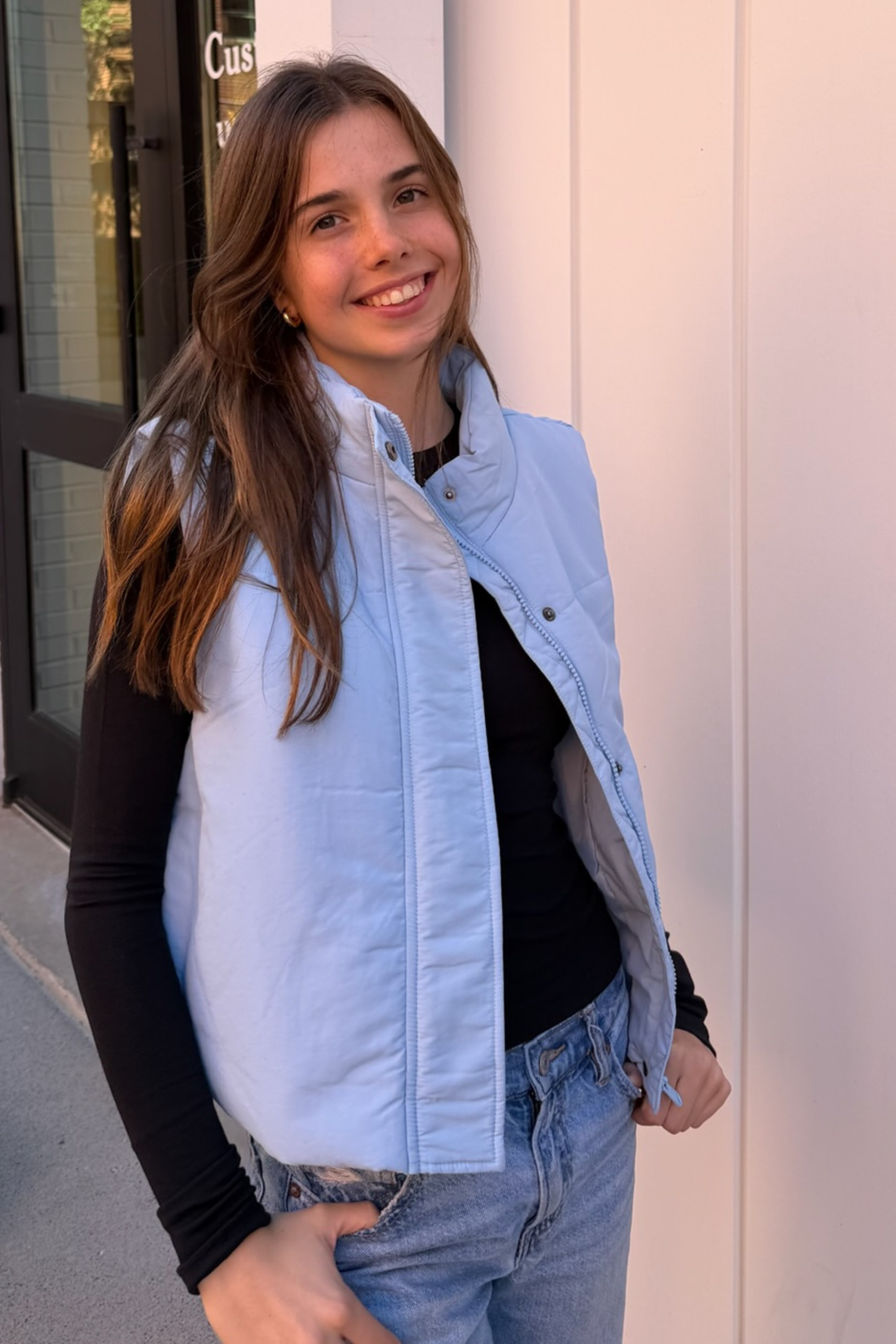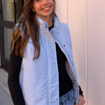 The Cleo Puffer Vest in baby blue adds a playful pop to your casual wardrobe. Its matte finish keeps things cool and understated, perfect for layering over your comfiest loungewear or pairing with jeans for a casually chic vibe. Stay cozy without sacrificing style!