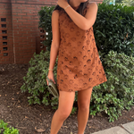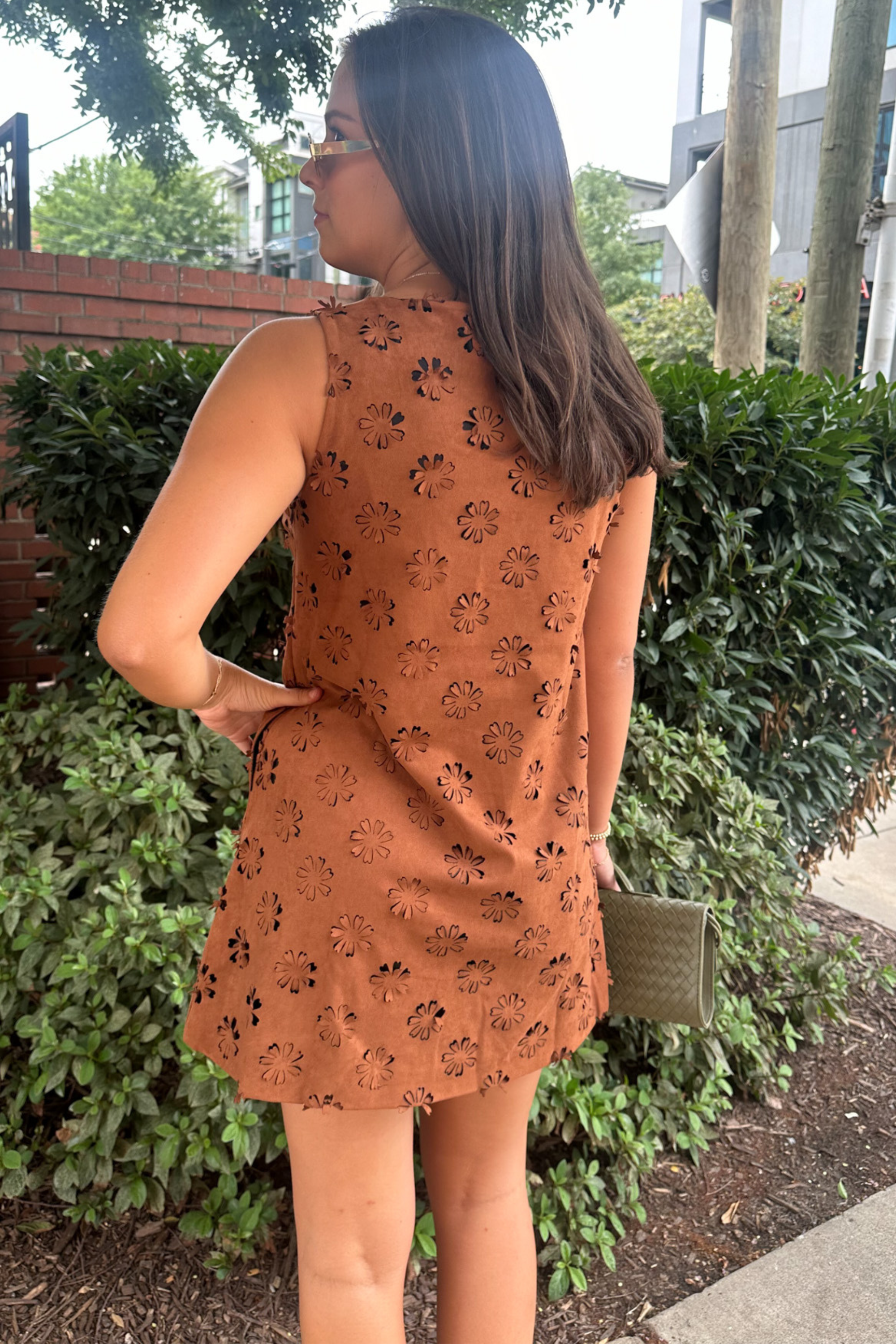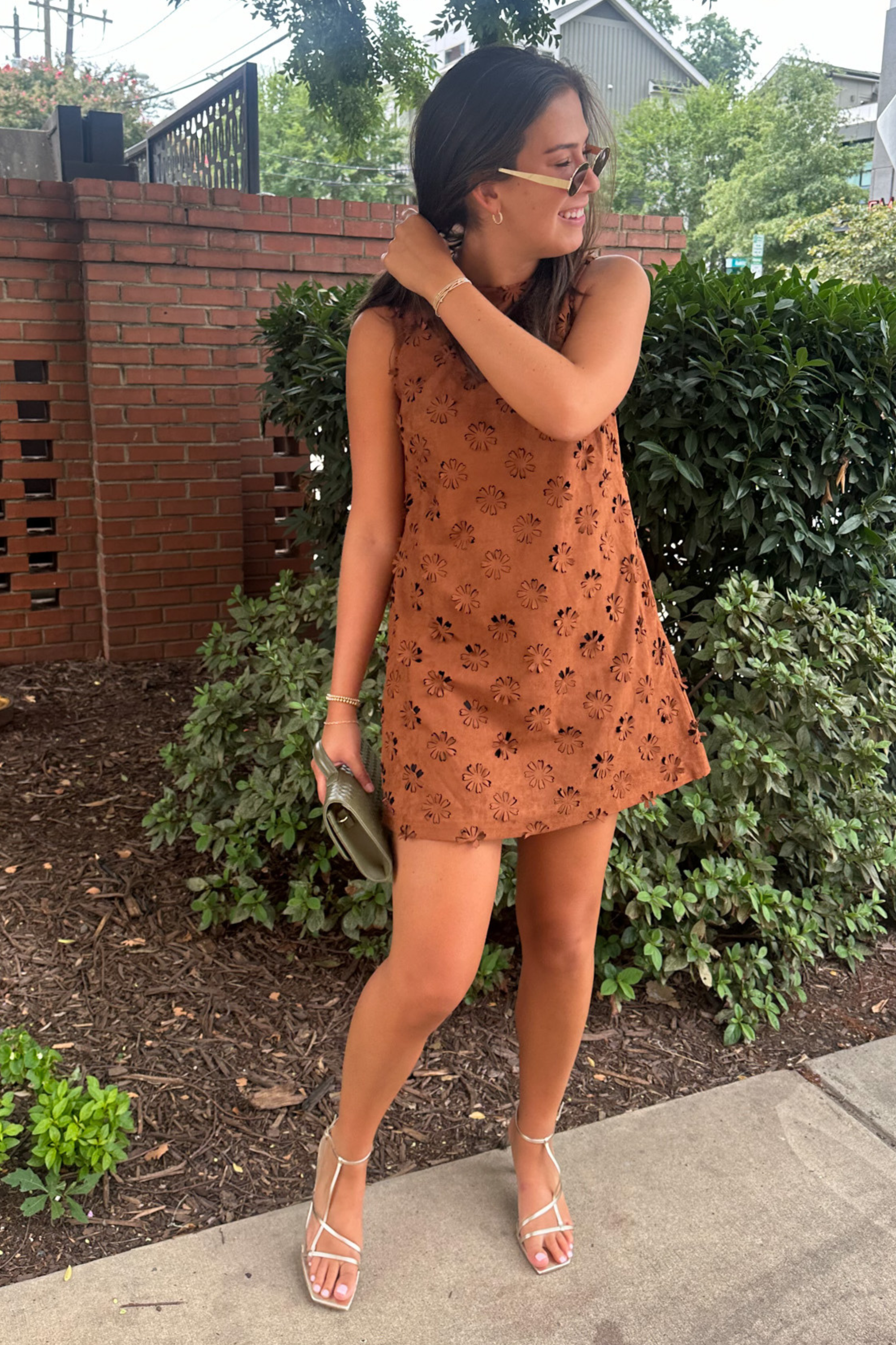 Celebrate fall in style with the Francies Flower Cut-Out Suede Mini Dress in warm brown. Its charming floral cut-outs and soft suede texture bring cozy vibes perfect for pairing with sandals or boots. Whether you're stepping out for a casual day or an evening gathering, this dress effortlessly blends autumn flair with playful comfort.