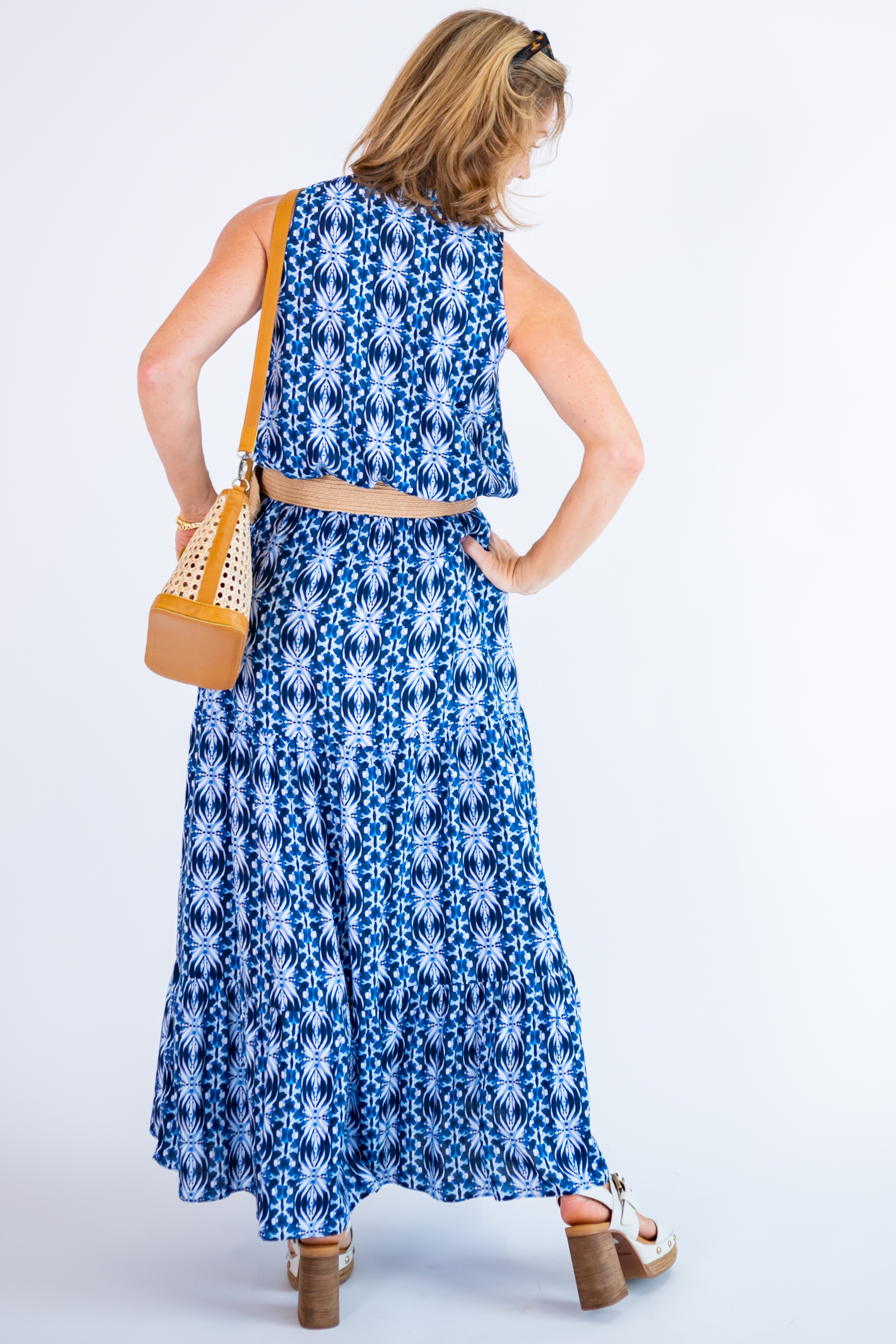 Introducing the Kathy V-Neck Top - Navy Shibori. This new top is the perfect addition to your wardrobe. Pair it with the Lillian skirt for a full set look, or dress it down with white jeans for a fun and effortless style. Versatile and chic, this top is a must-have!