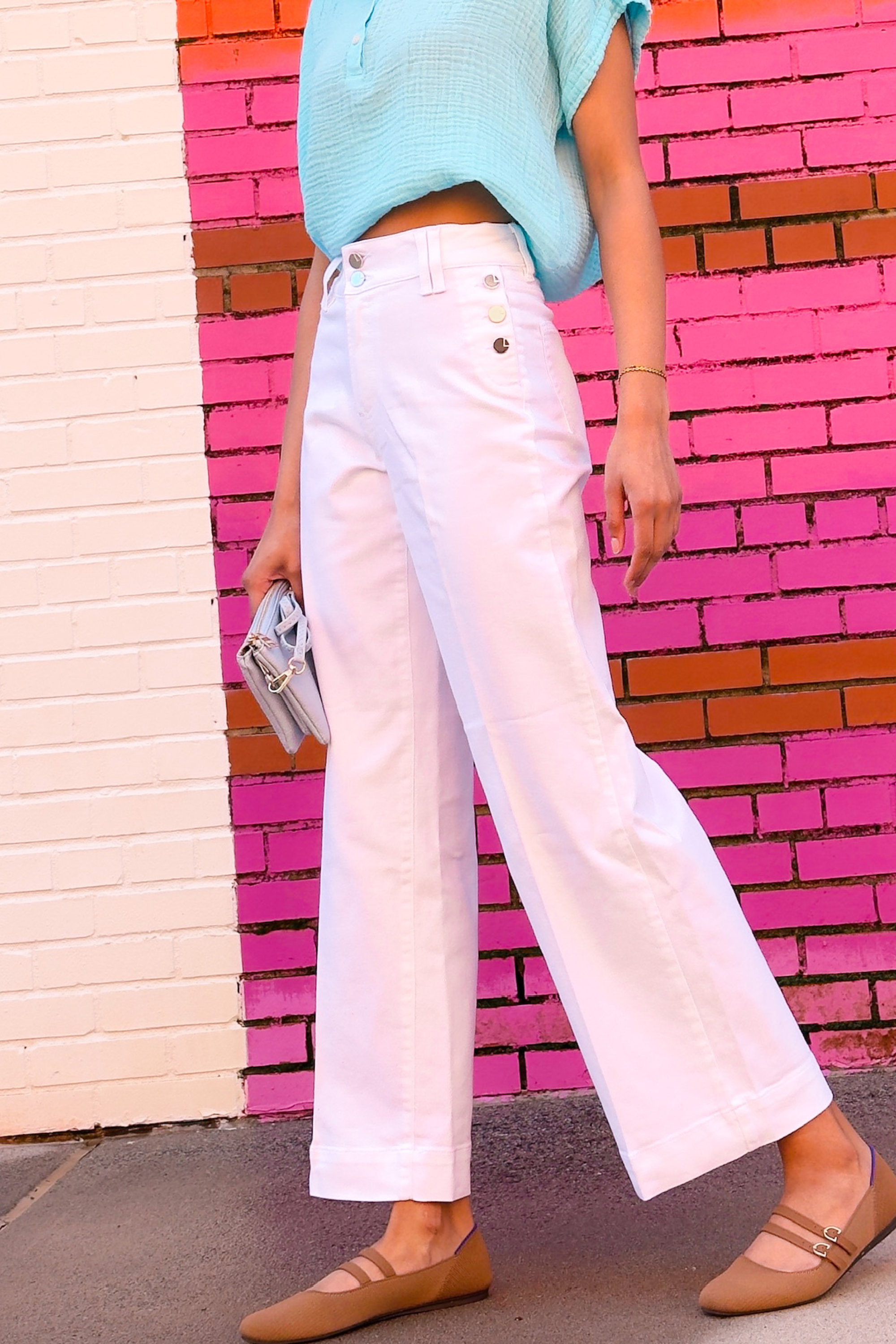 Embrace effortless style with the Colette in White, featuring seamed pockets accented by silver hardware buttons for a refined touch. The front pleating down both legs adds a clean, tailored look with just a hint of maritime inspiration, making these jeans the perfect blend of classic elegance and modern flair.