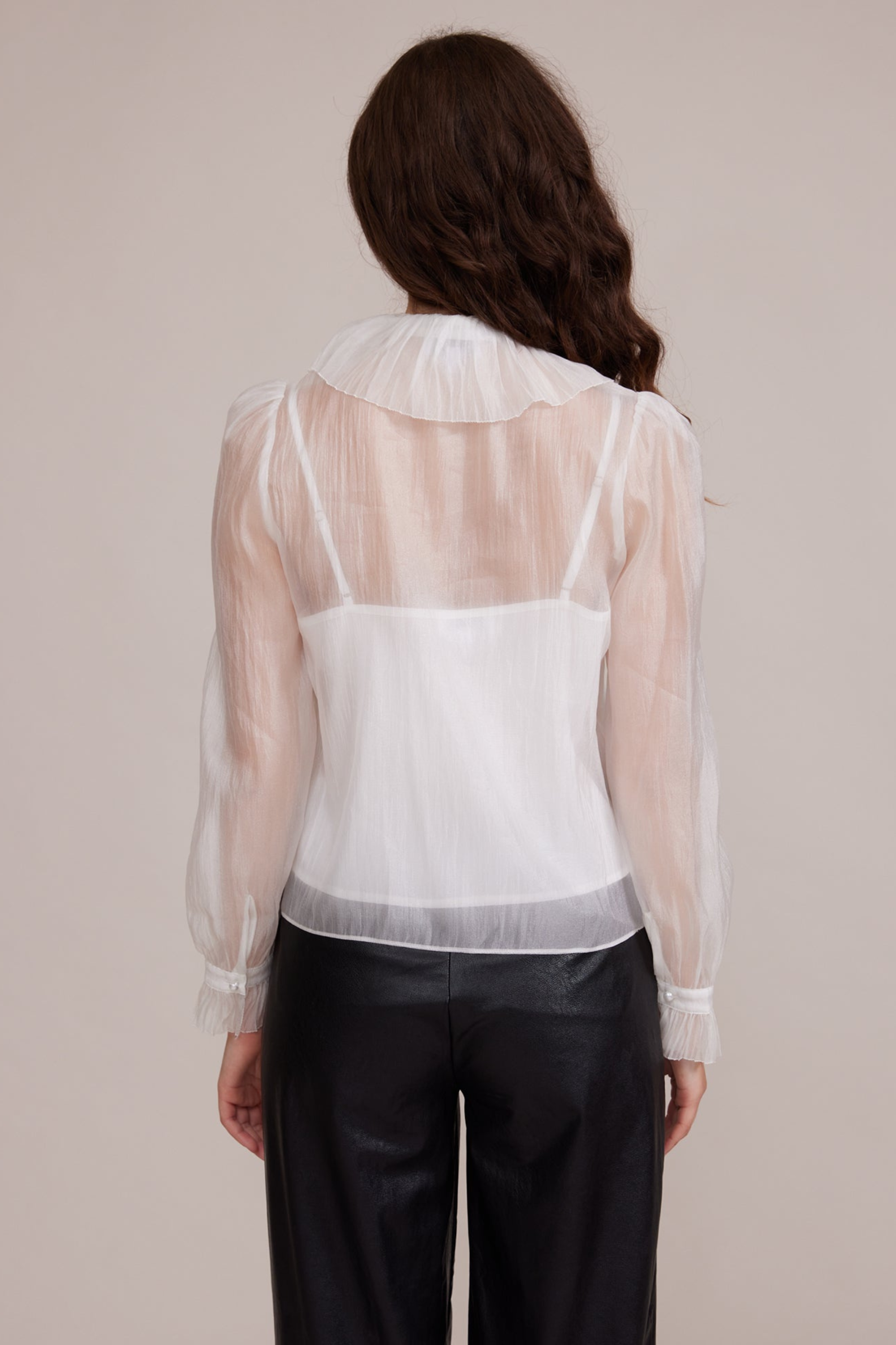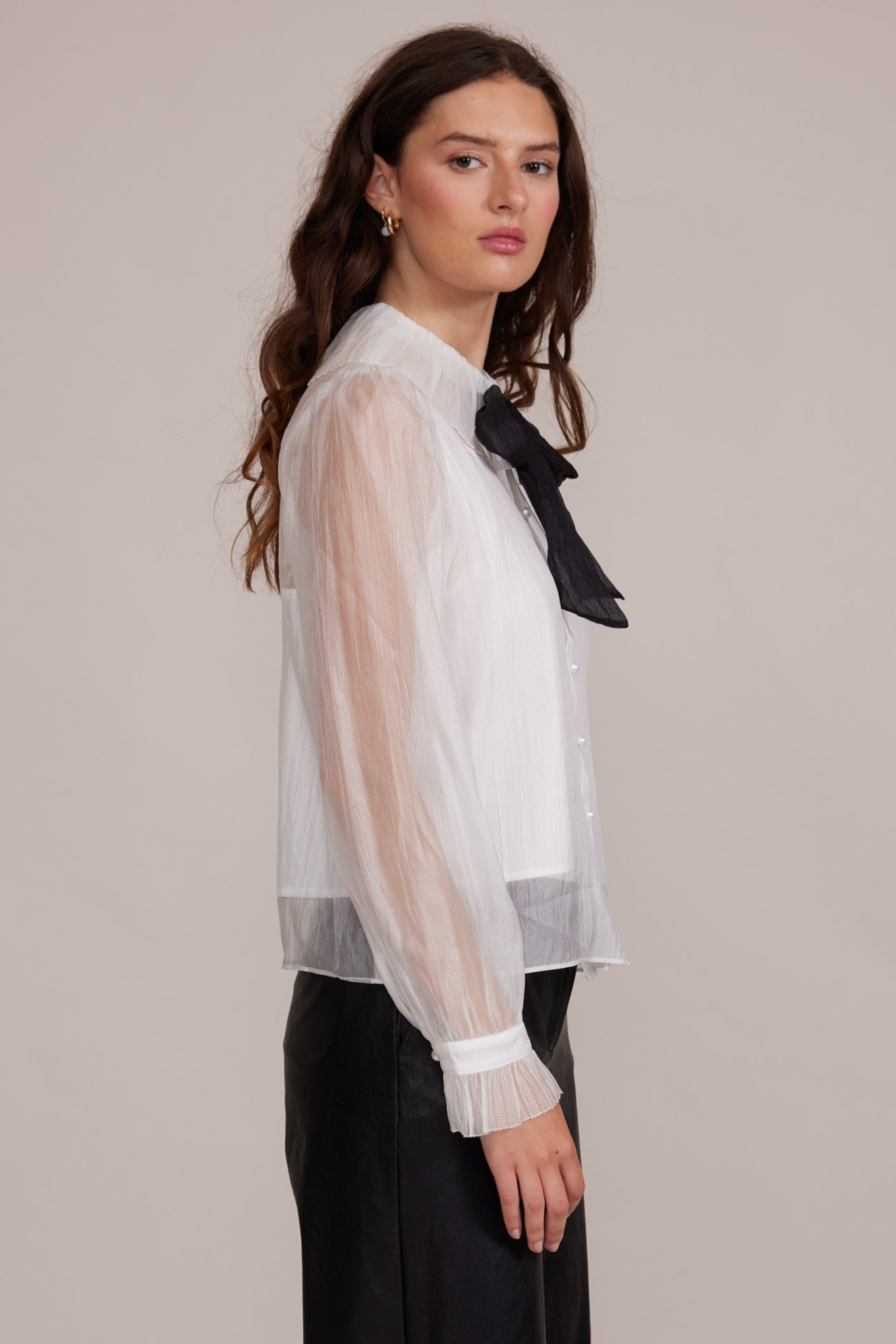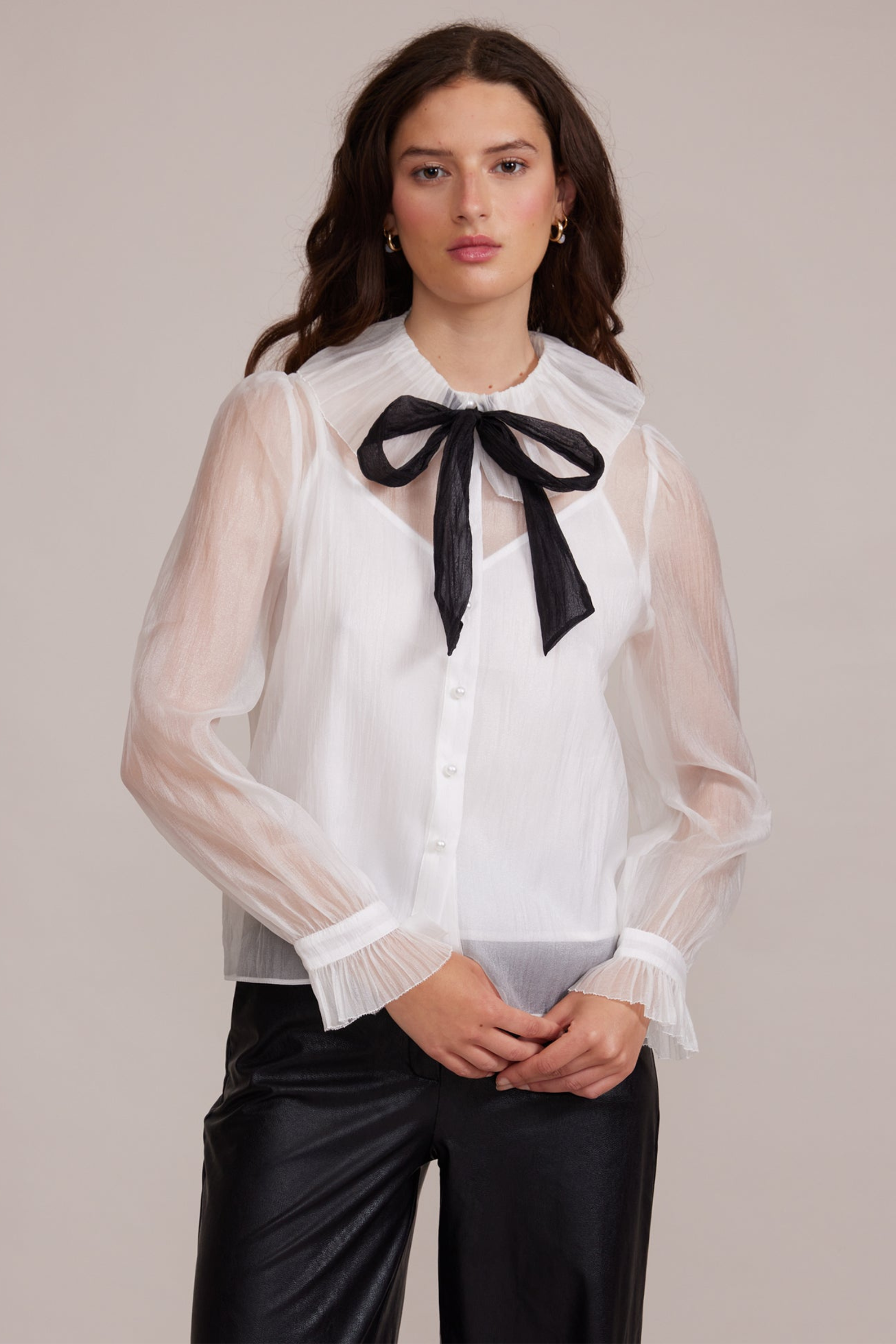 This Garance Bow Button Down Blouse features delicate ruffle sleeves and a sheer design, creating a feminine and elegant look for a fun holiday party! The black tie bow adds a touch of sophistication. This blouse is perfect for any occasion and fits true to size for comfortable wear.
