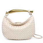 This Top-Handle Woven Dumpling Bag in off-white brings a playful twist to your outfit with its statement gold top handle. Crafted with woven texture, it offers a chic yet relaxed vibe. Plus, the included crossbody strap means you can easily switch from day to night looks without missing a beat. Perfect for hands-free adventures or making an entrance!