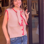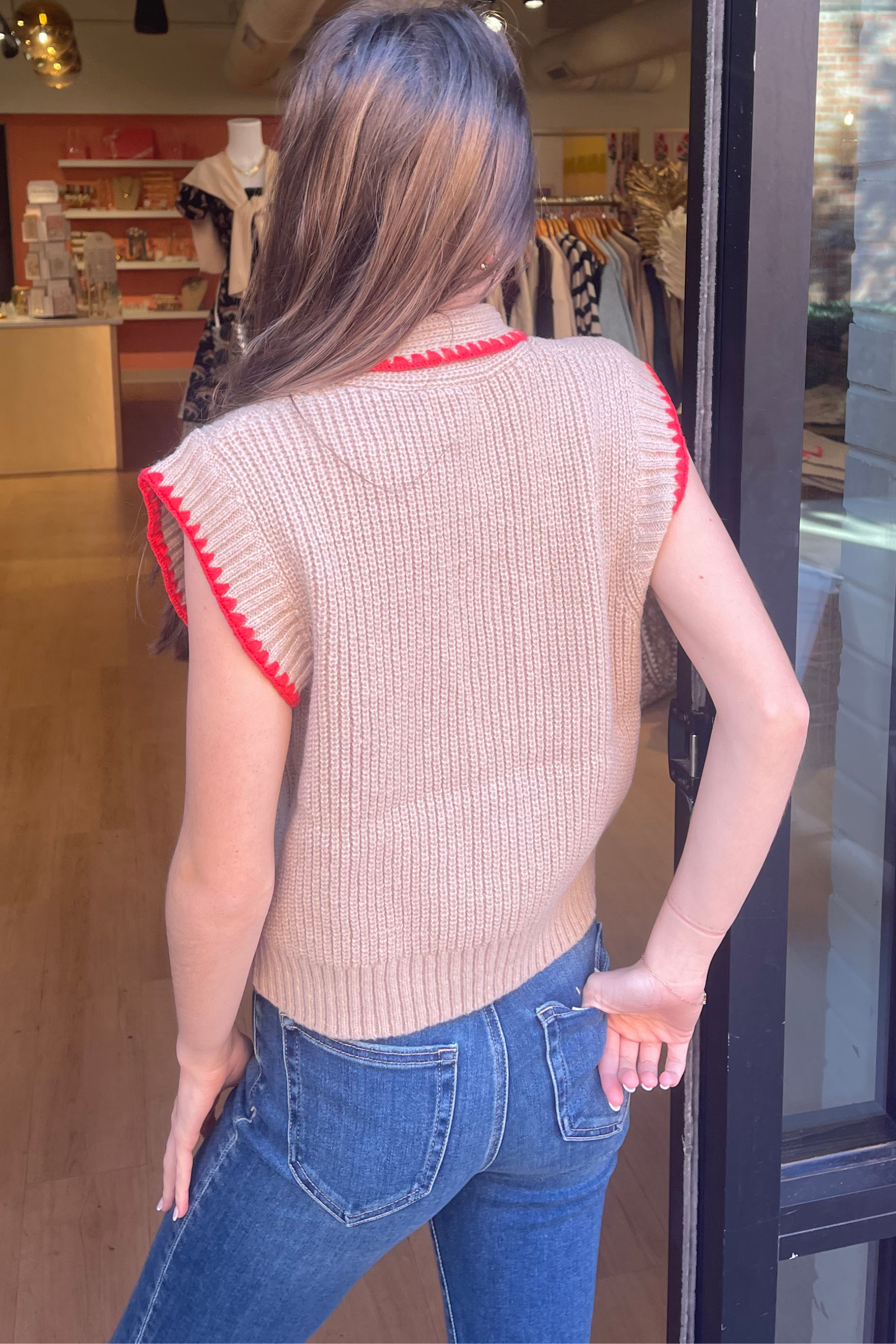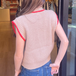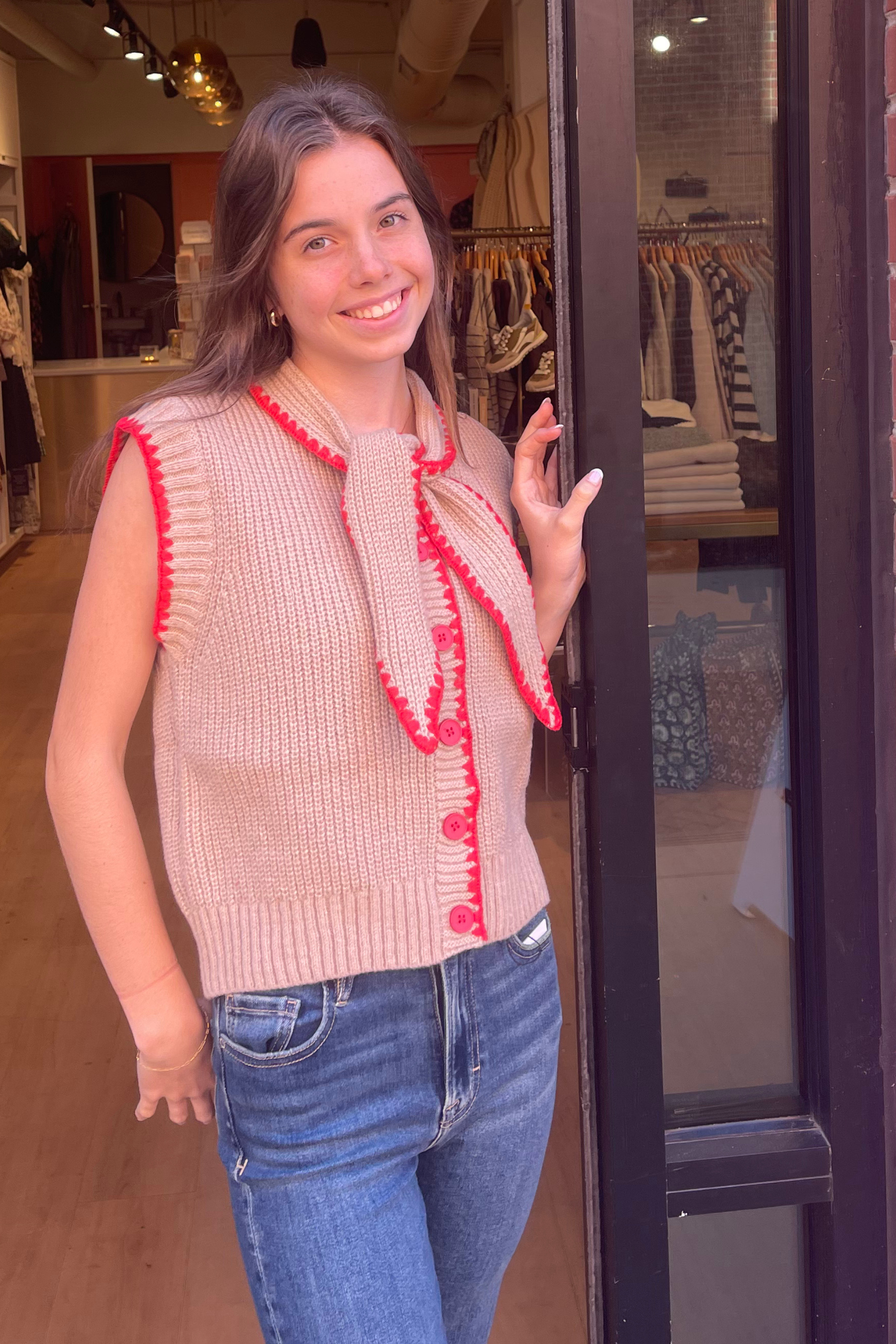 Mollie Sleeveless Sweater w/ Scarf - Taupe/Red