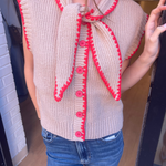 This sleeveless sweater top features a playful scarf neck detail and stylish contrast stitching, adding a fun twist to your outfit. Perfect for pairing with your favorite jeans or a cute skirt, it’s a versatile piece that brightens up any wardrobe with effortless charm.