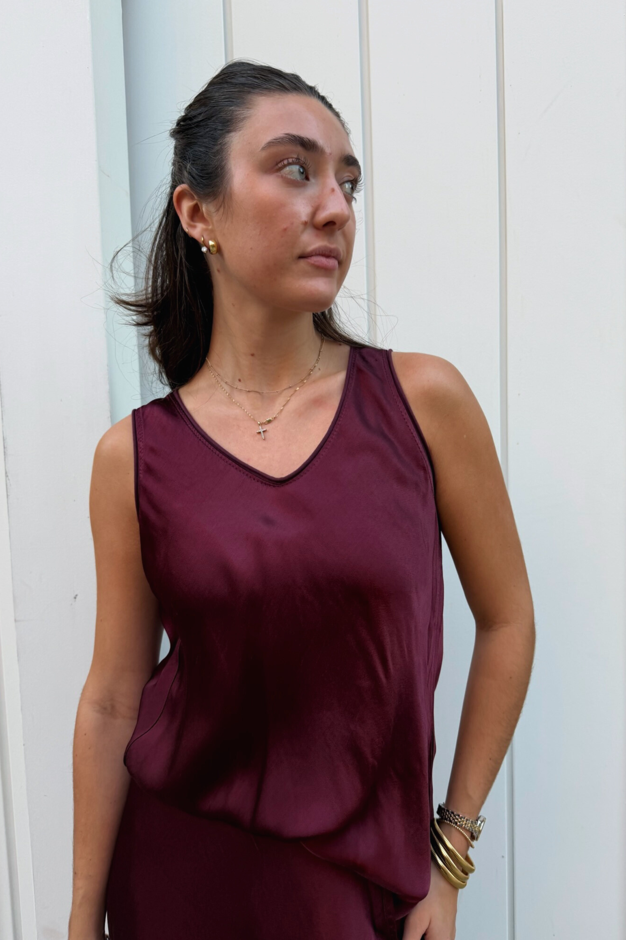 The Bria Silky Soft Tank Top in wine is your new wardrobe MVP. Crafted from luxuriously smooth fabric that feels as good as it looks, this elevated basic pairs effortlessly with the Jennie Skirt for an instantly polished ensemble. The rich wine hue adds sophistication to any outfit while maintaining that coveted ease of a go-to tank. Layer it, style it solo, or dress it up—this silky essential does it all with understated elegance.