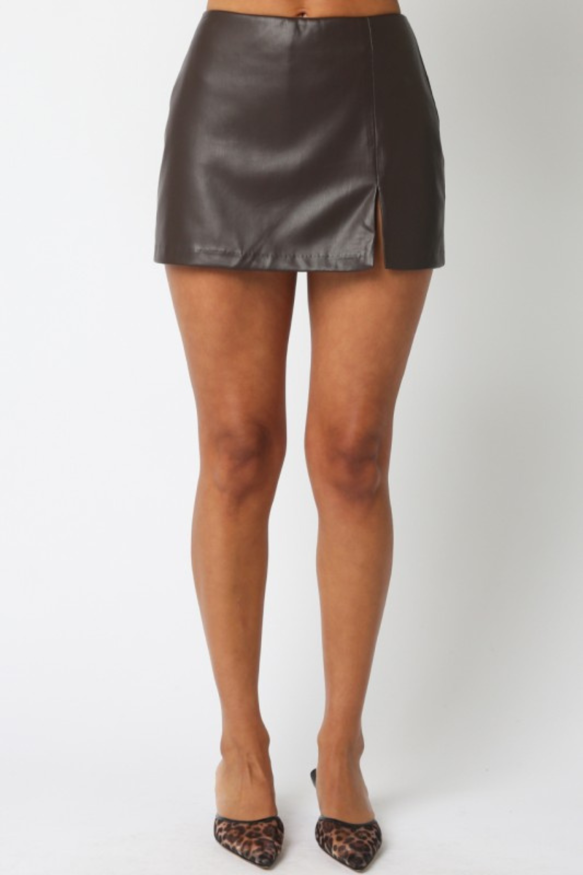 Get ready to cheer in style with the Game Day Skort in Brown! This fun mini skirt features a sleek leather look with a playful side slit and built-in shorts for comfort and confidence. Perfect for showing your team spirit while staying active and fashionable all game long.