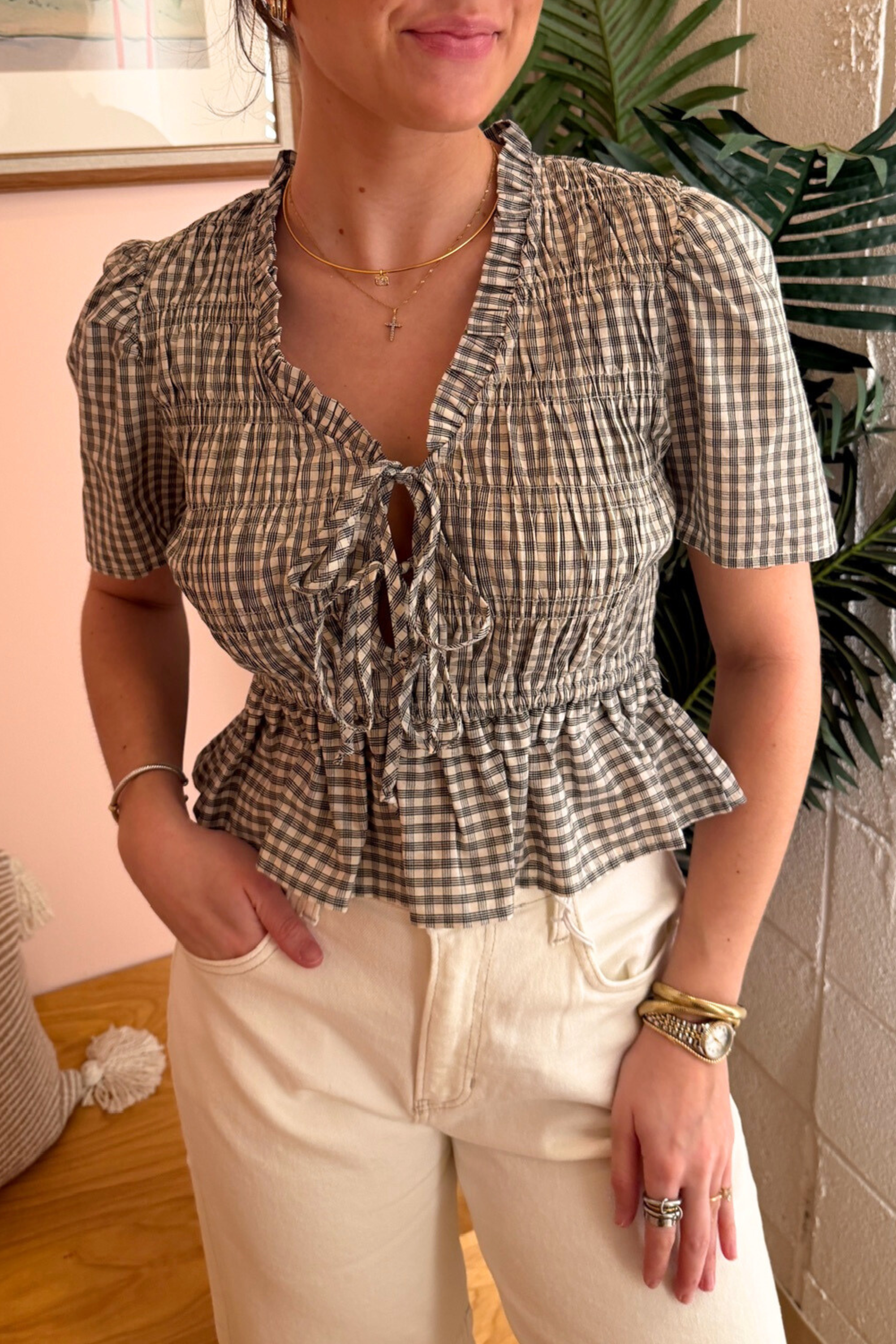 Elevate your spring wardrobe with this charming gingham puff sleeve top in cream and black. The playful gingham pattern and romantic puff sleeves bring effortless style to any season. Pair it back with the Aria Skirt for an instantly put-together look that's perfect for brunch, errands, or casual outings. A versatile essential that transitions beautifully from day to night.