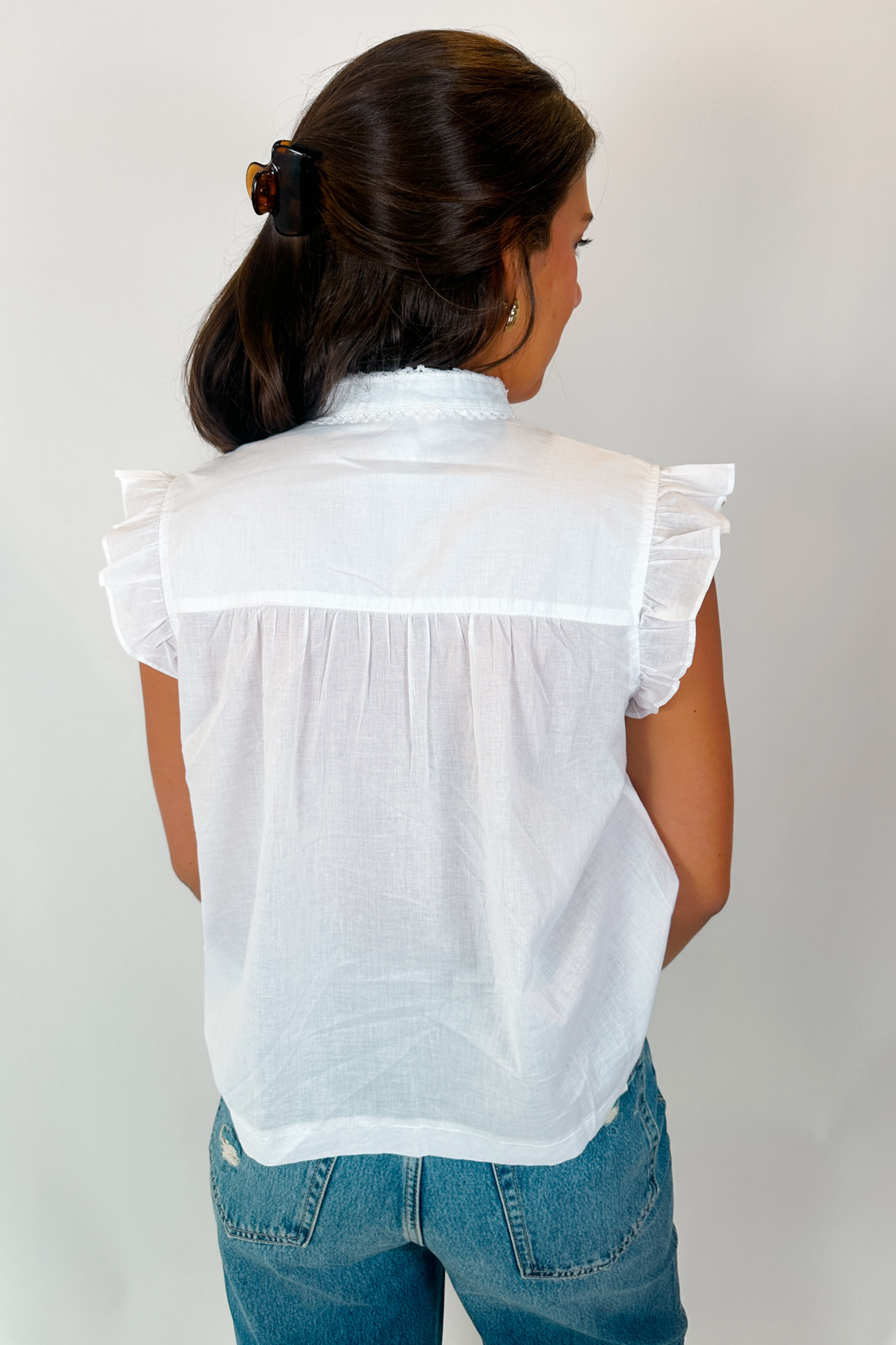 The Miley Flutter Sleeve Top in crisp white features subtle ruffle sleeves and a flattering V-cut with a playful tie. Delicate embroidery adds a charming touch, while the breathable fabric keeps you cool and comfortable. Perfect for brightening up your workday or enjoying sunny summer outings with a fun, fresh vibe.