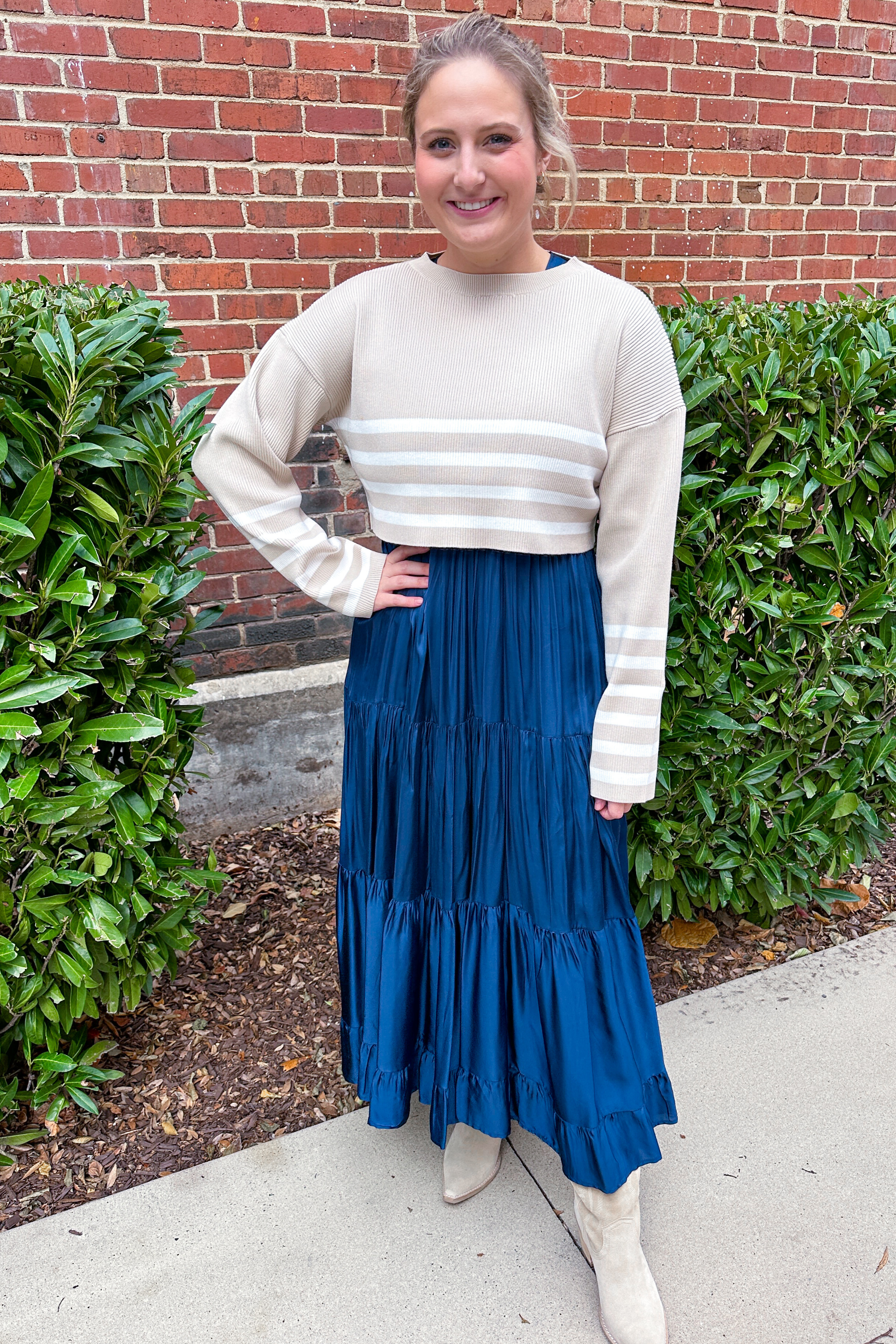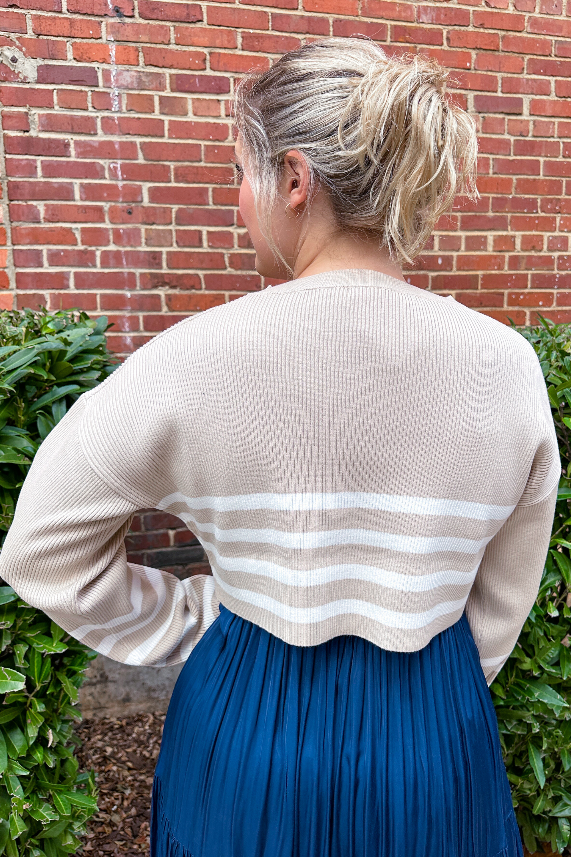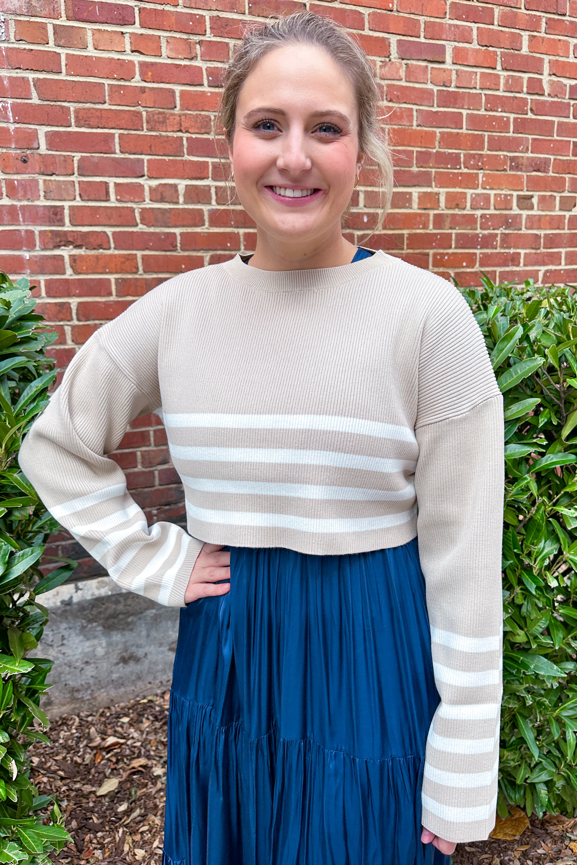Cozy up in our Noa Striped Crop Sweater! It is the perfect sweater for layering pieces, especially over dresses or with your favorite skirts. This long sleeve sweater is comfortable and effortlessly chic!