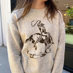 Step into cozy style with the Cori Giddy Up Sweater in Oatmeal. This warm, western-inspired sweater brings a trendy twist to your wardrobe with its soft, inviting texture and relaxed fit. Perfect for layering on cool days, it adds a playful yet chic touch to any outfit, making you ready to giddy up and go with easygoing charm.