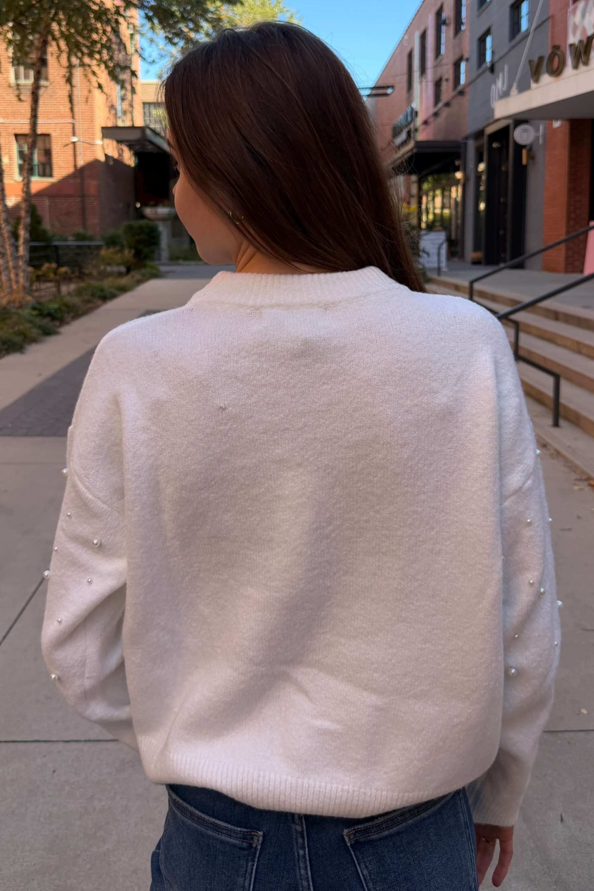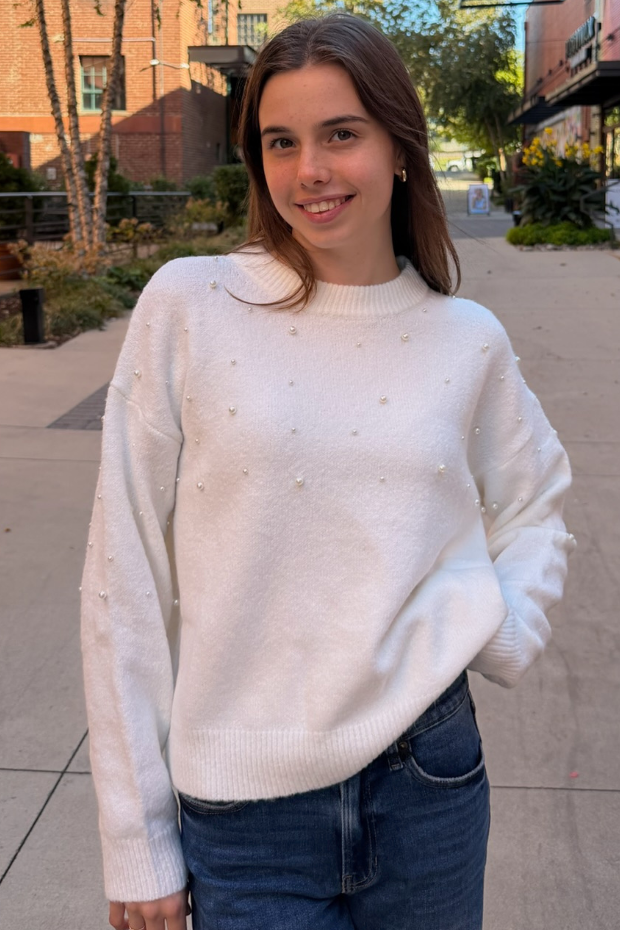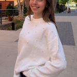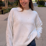 Elevate your everyday wardrobe with this soft ivory sweater, featuring playful pearl embellishments that add just the right touch of sophistication. The luxurious knit feels as good as it looks, making it the perfect layering piece for any season. Dress it up or down—this timeless staple with a modern twist is about to become your go-to favorite.
