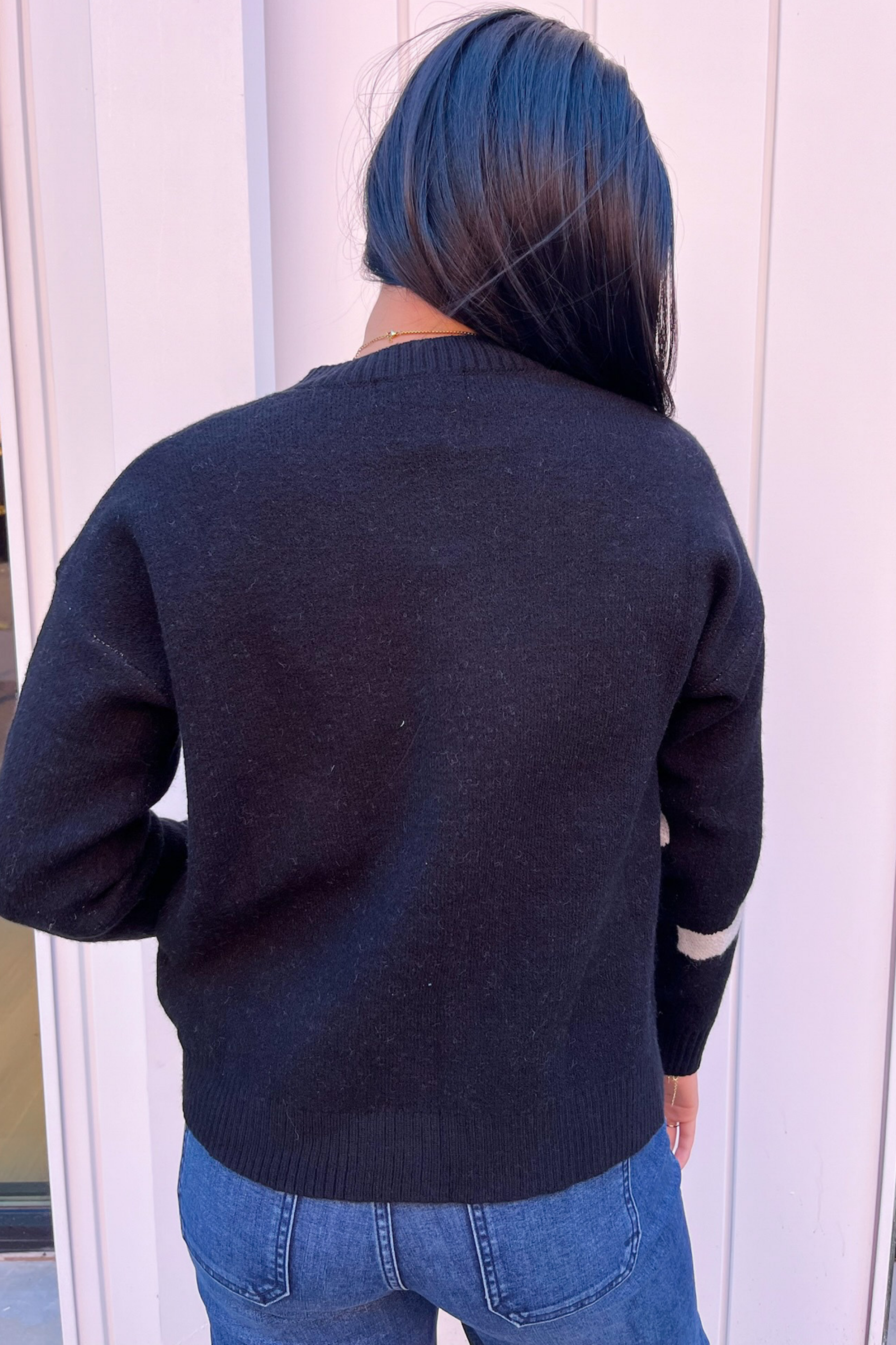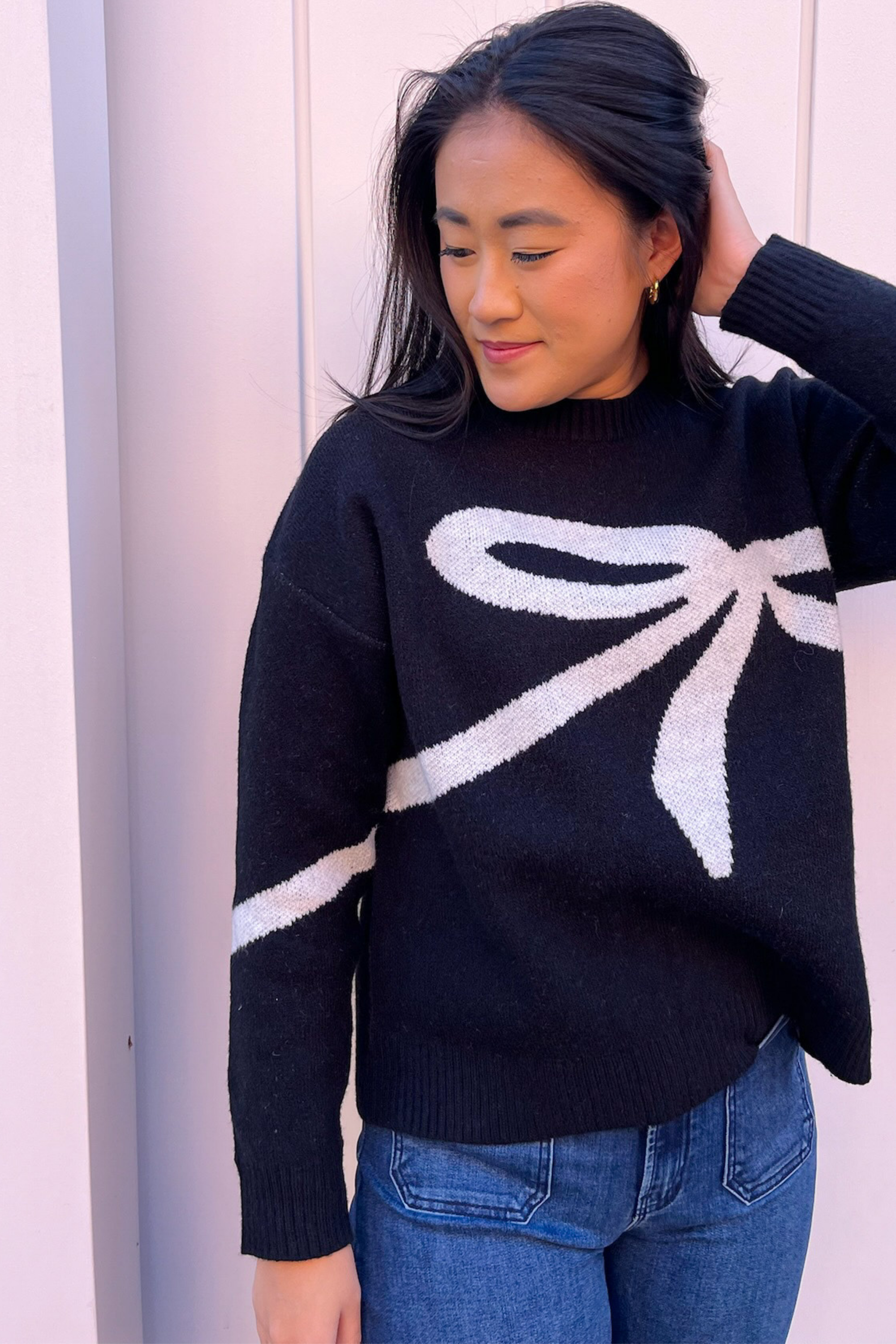 Get ready for the holidays with the Wrap Me Up Sweater in black! Perfect for the holiday season, this adorable and cozy sweater features a charming bow pattern that adds a touch of festive flair to your wardrobe. Stay warm and stylish all winter long with this must-have piece.