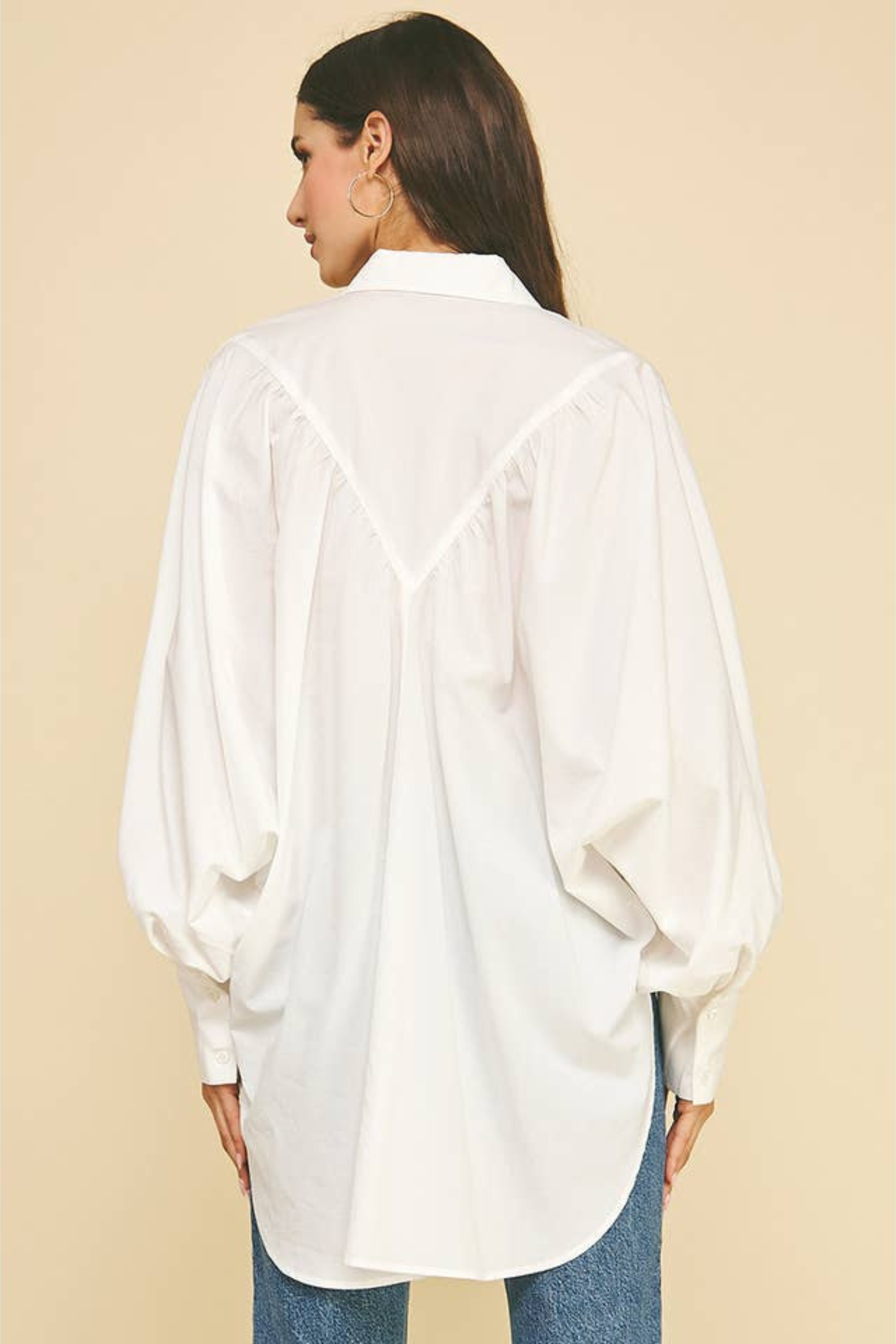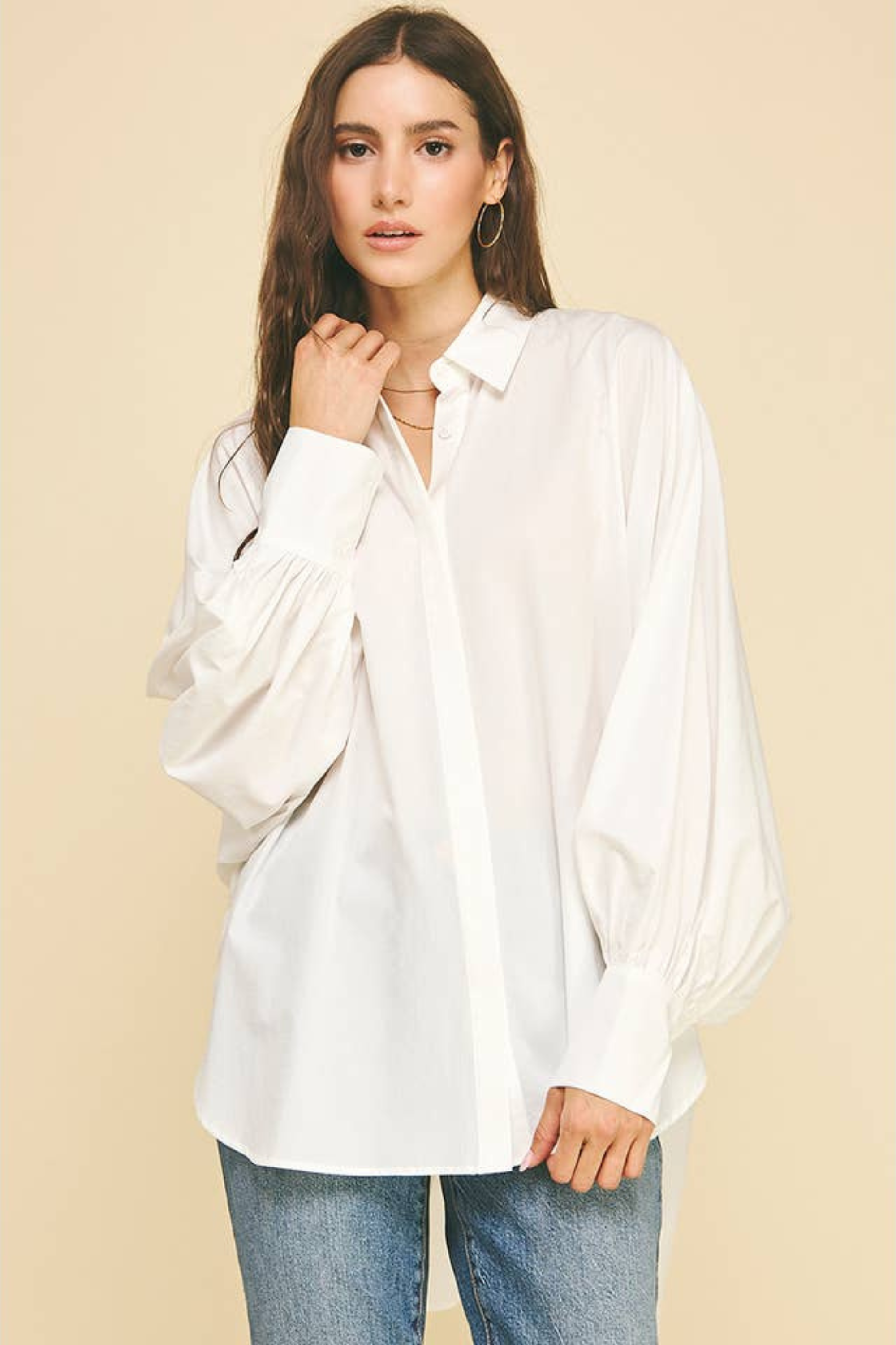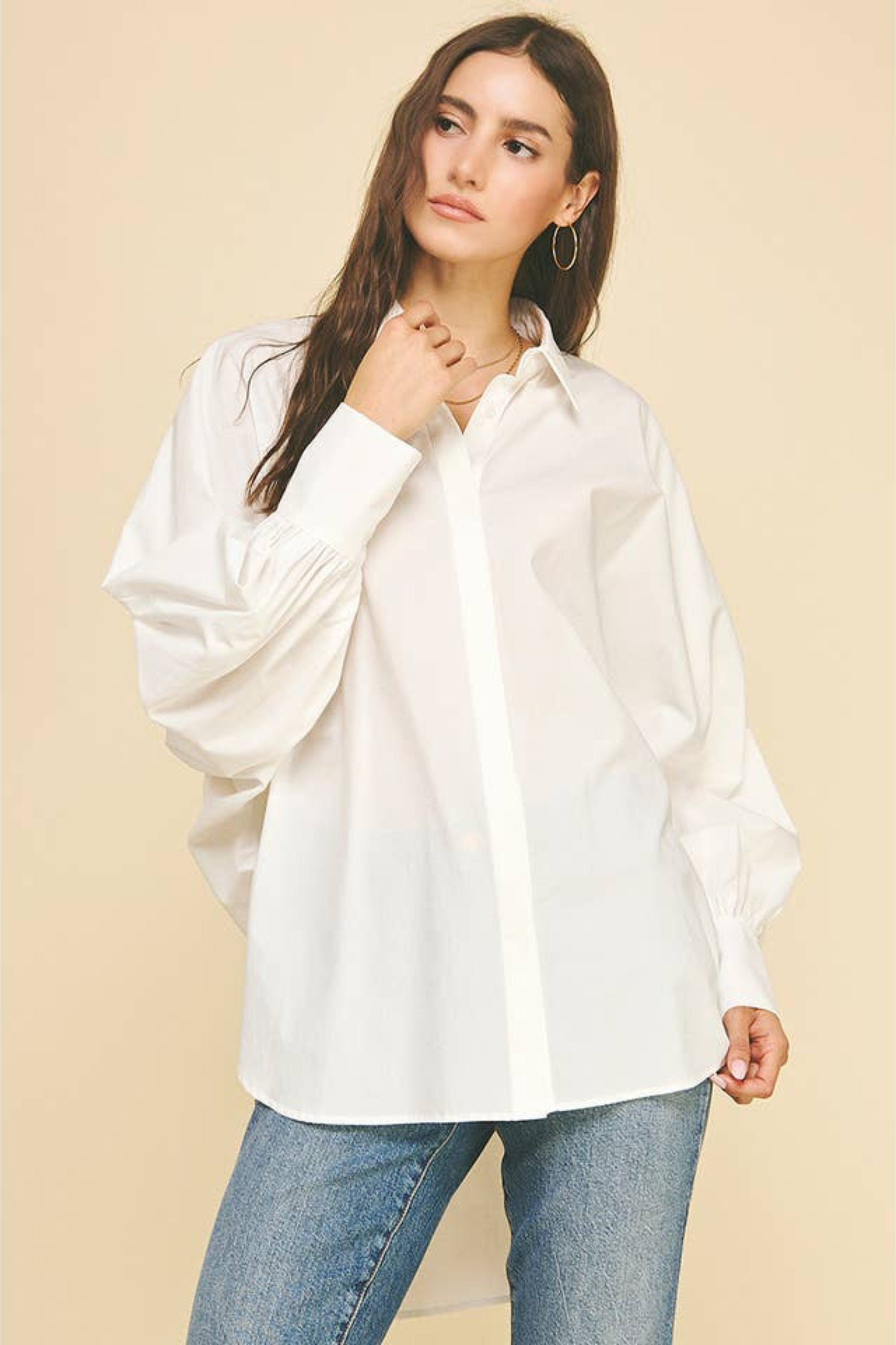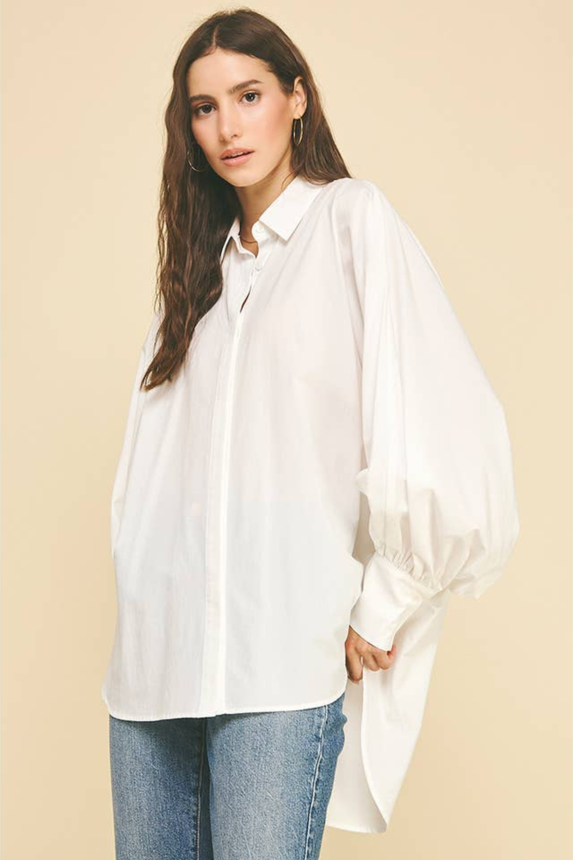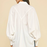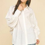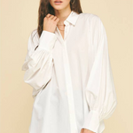 Embrace effortless style with the Zoe Poplin Balloon Sleeve Oversized Shirt in Off White. Its roomy fit and playful balloon sleeves make it a standout piece that's perfect for layering. Pair it with your favorite denim for a casual vibe, or add a cozy sweater or sweater vest on top to switch up your look with ease. This shirt brings comfort and fun to your everyday wardrobe!