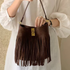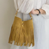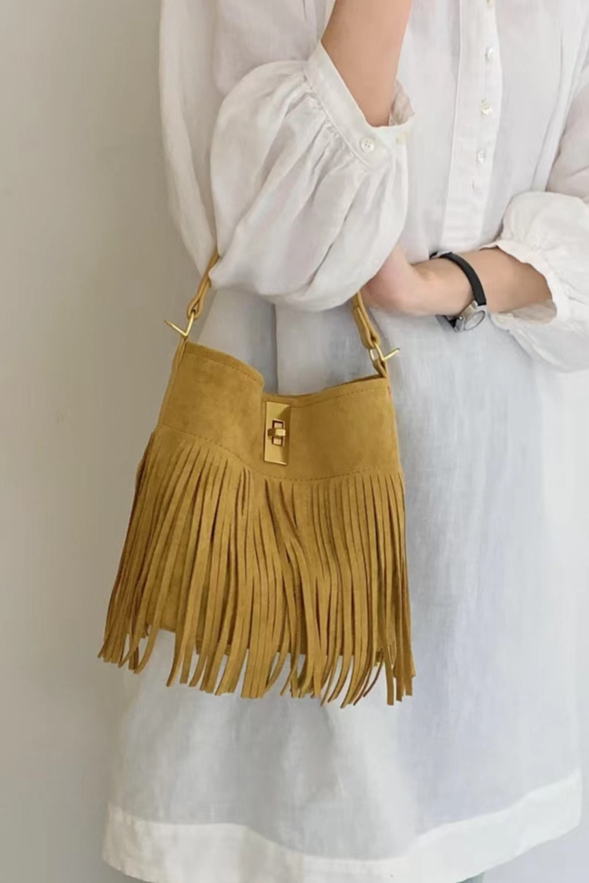Add a pop of playful style with the Greta Suede Fringe Bucket Bag in Mustard. Crafted from soft suede, it features a fun fringe detail that moves with you. Carry it your way—use the top handle for a chic grip or switch to the crossbody strap for hands-free ease. Perfect for adding a touch of boho flair to any outfit.