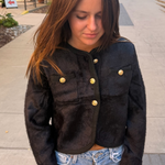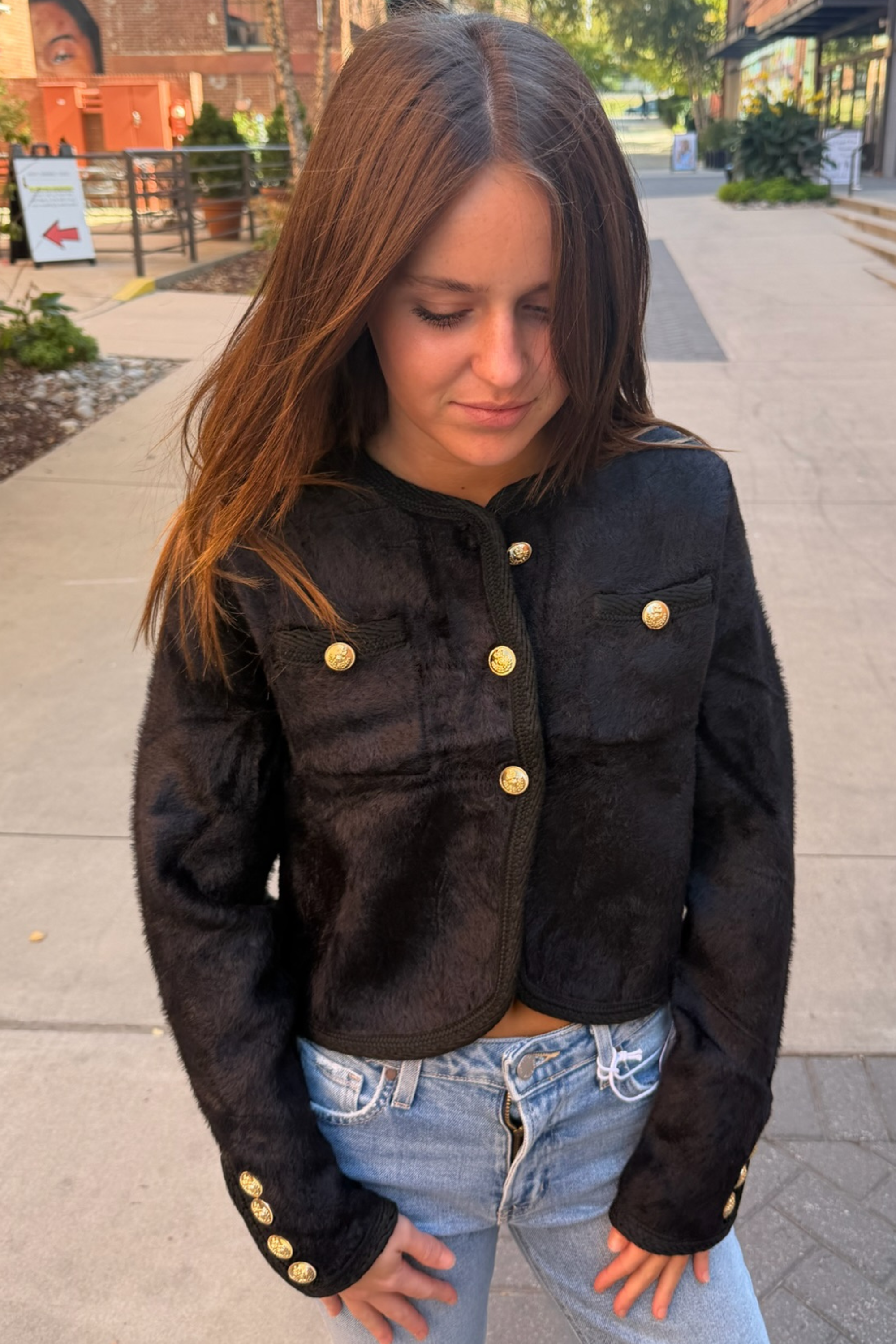 Introducing the Fifi Fluffy Cardigan Jacket! This chic black button-up features gorgeous gold detailing that adds just the right amount of sparkle. Whether you're dressing up a casual outfit or adding polish to your evening look, this jacket is the perfect finishing touch that makes every ensemble feel special.