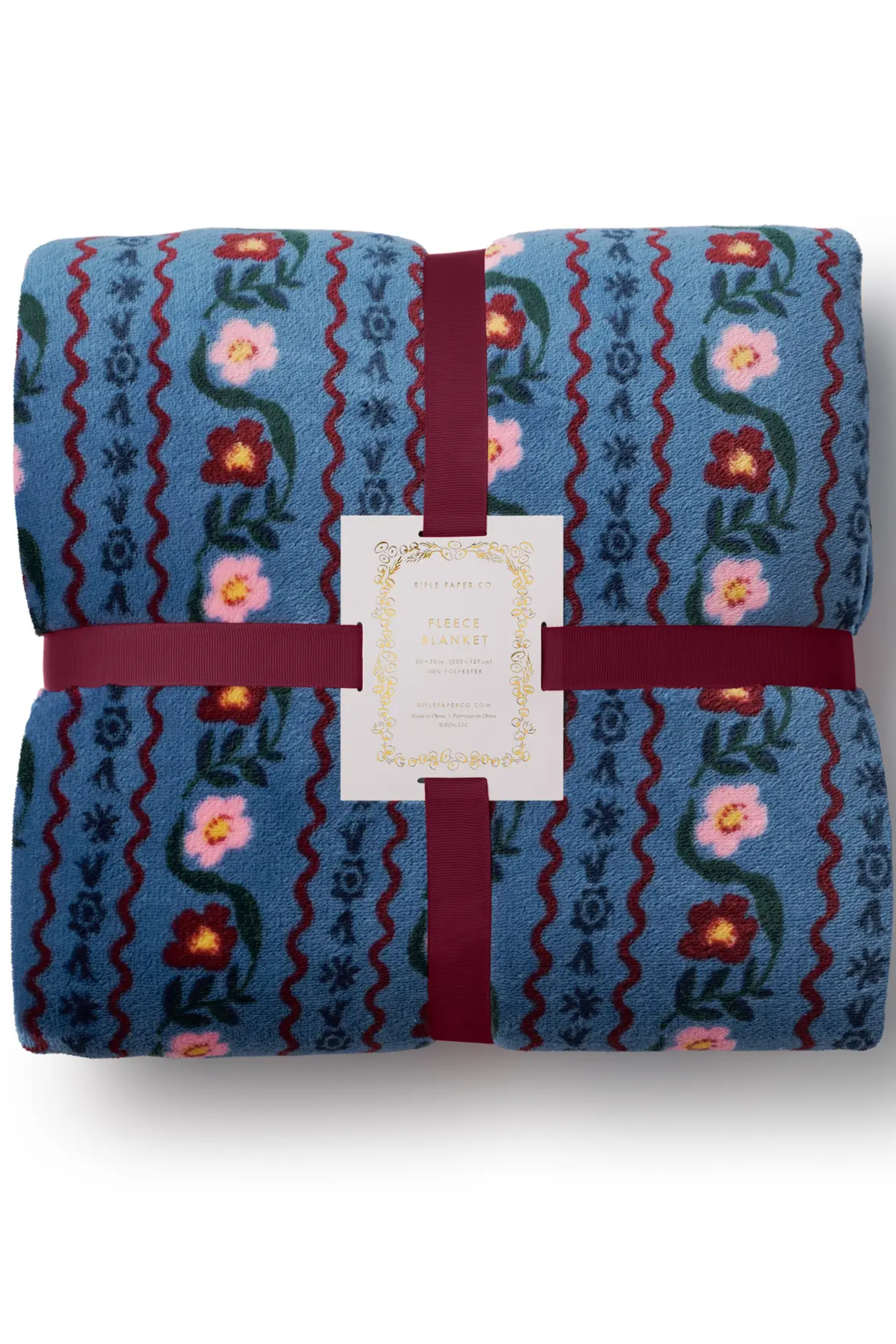 Curl up with a cozy fleece blanket featuring delicate stripes of our Delphine florals. Made of plush fleece, the blanket comes packaged with a ribbon so it’s ready to gift.