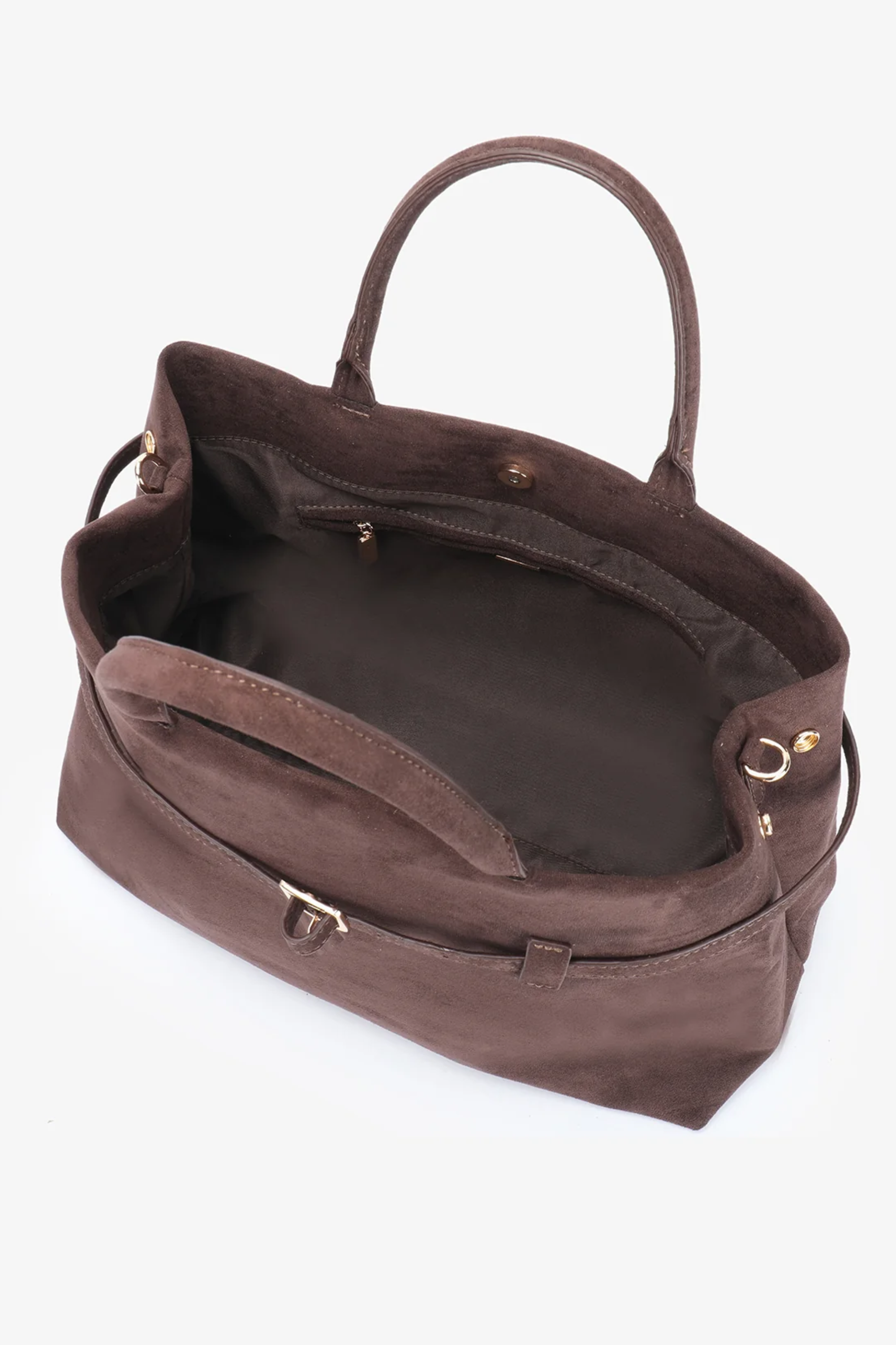 This chic, structured satchel takes the classic doctor bag shape and gives it a soft, modern update. It's roomy enough for everything you need and features a sleek silhouette, sturdy top handles, and a cool gold-tone buckle detail on the front. It's the perfect statement piece to make any outfit look instantly polished and ready for anything.