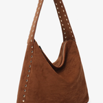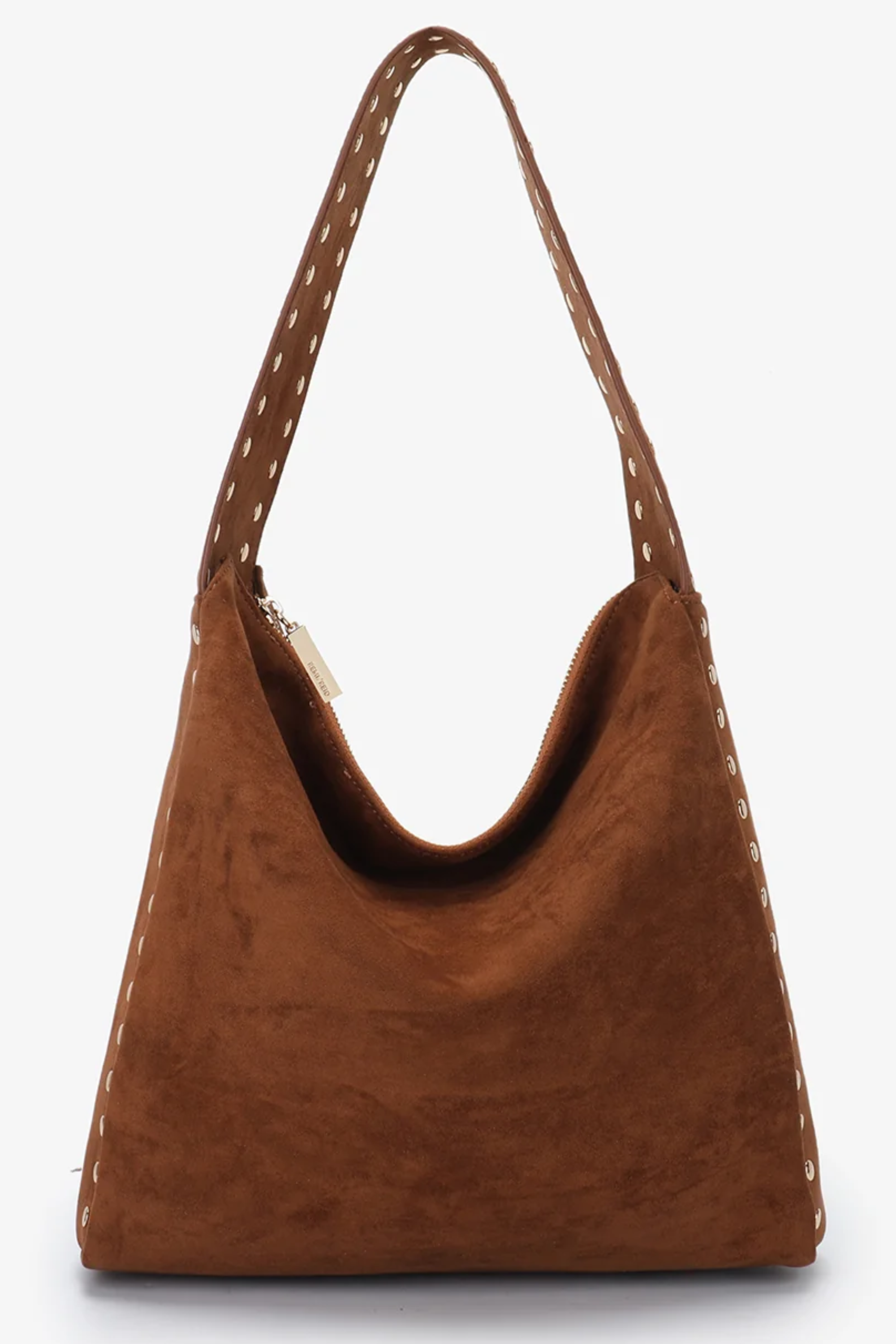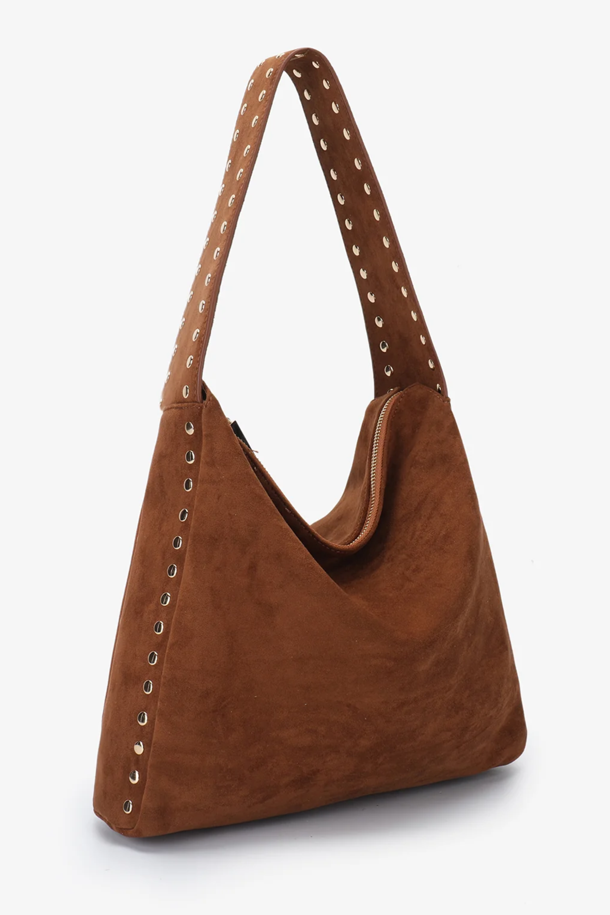 Made from smooth, faux suede with a chic, slouchy shape, this bag is roomy enough for your daily essentials. The striking gold-tone studs along the strap and side seams turn this simple tote into a total statement piece. It's the perfect accessory to level up any look, day or night!