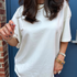 Minimalist Details: Square-cut body, extended sleeves, and clean neckline.