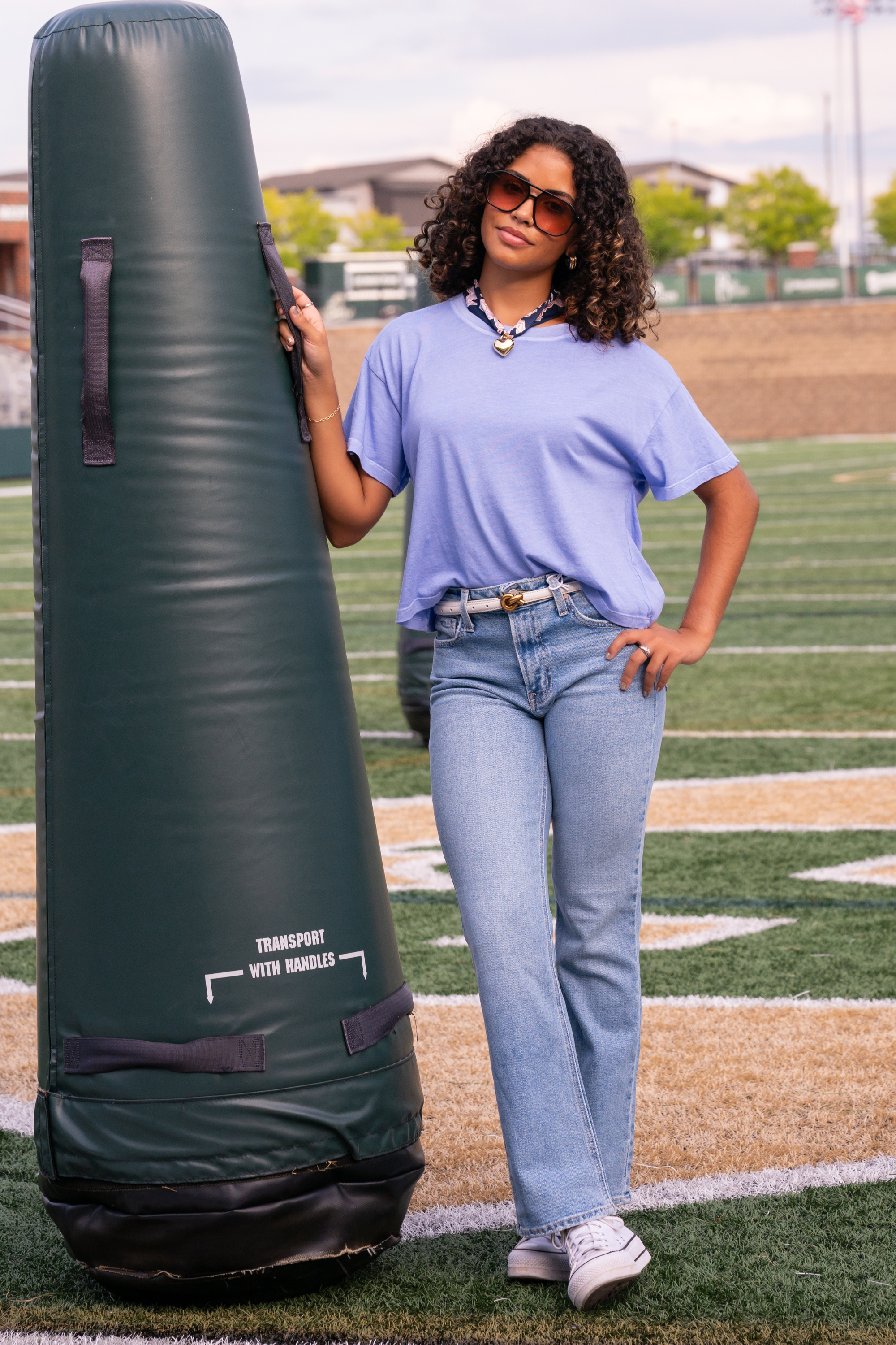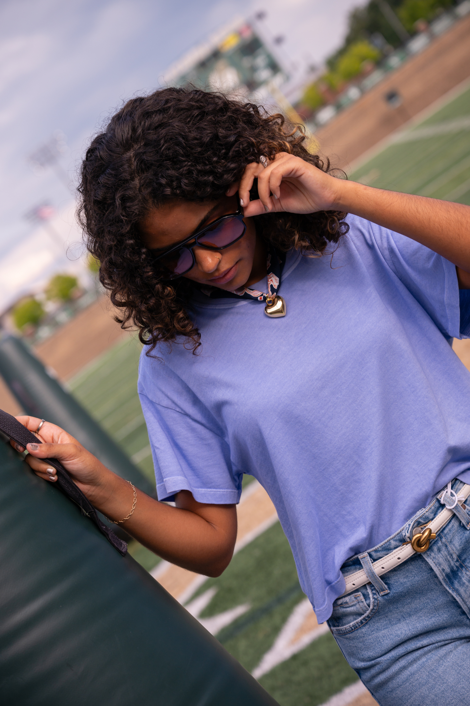 This Drew Crop T-shirt in a playful periwinkle blue adds a fresh pop to your basics. Its classic cropped cut keeps it cool and casual, while the vibrant hue brings a fun twist to any outfit. Perfect for mixing and matching with your favorite jeans or skirts for an effortlessly stylish look.