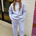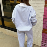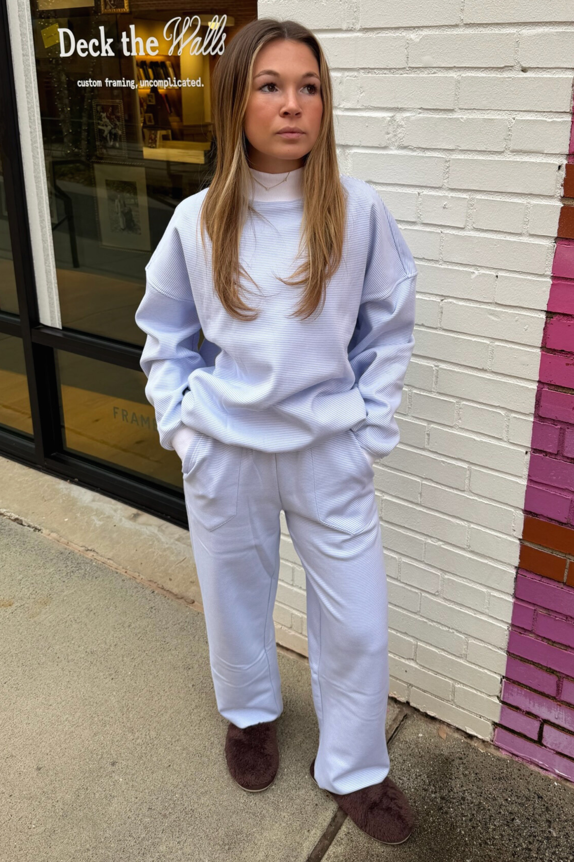 Cozy striped sweatpants that transition seamlessly from chilly winter days to breezy spring mornings. The classic blue and white stripes add playful charm to your casual wardrobe, while the soft fabric keeps you comfortable whether you're lounging at home or running errands around town. Perfect for layering or wearing solo—a versatile staple that works year-round.