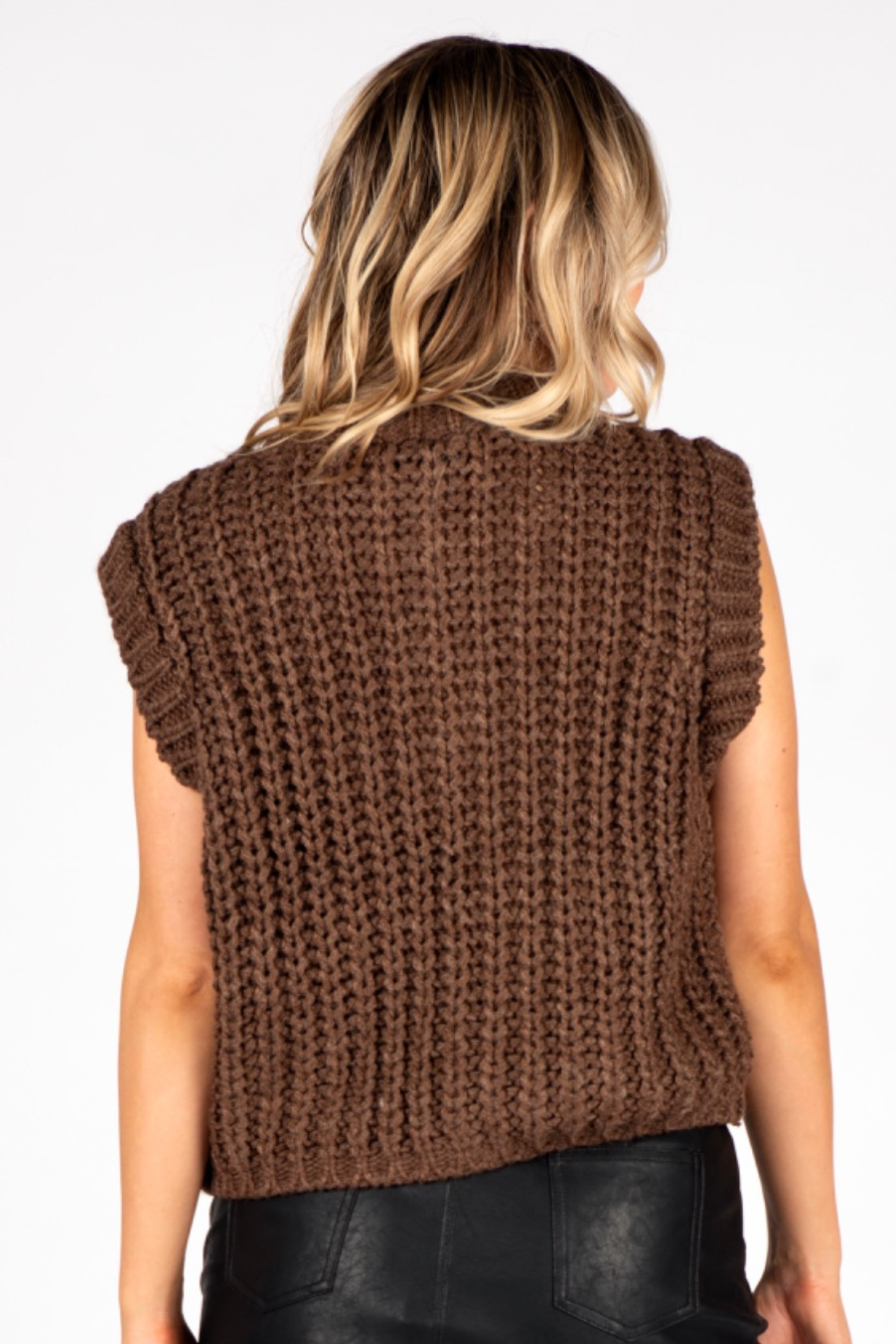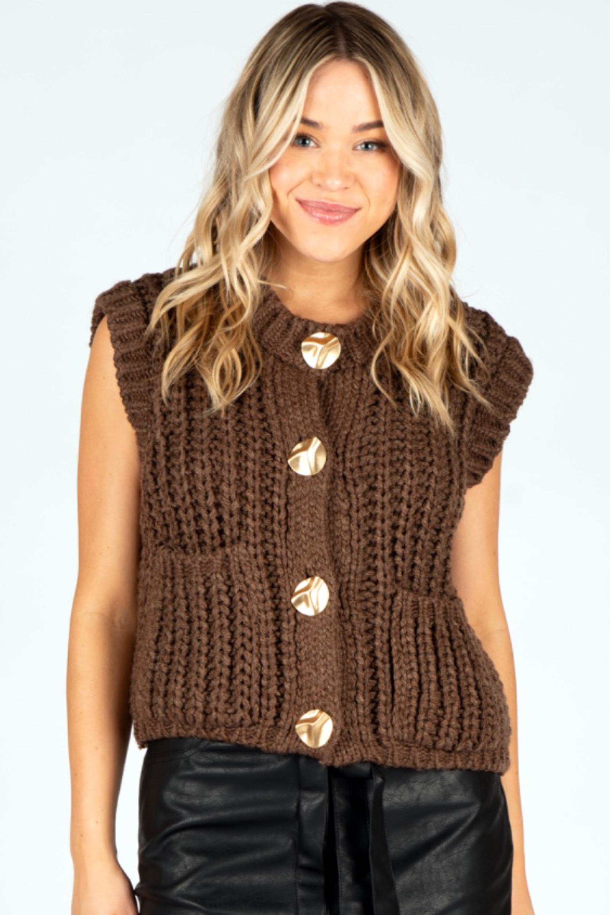 This chunky short sleeve sweater in warm brown features charming gold button details that add a touch of sparkle. Its cozy texture and playful design make it the perfect match for your favorite skirts, creating a stylish and fun outfit for any casual day.