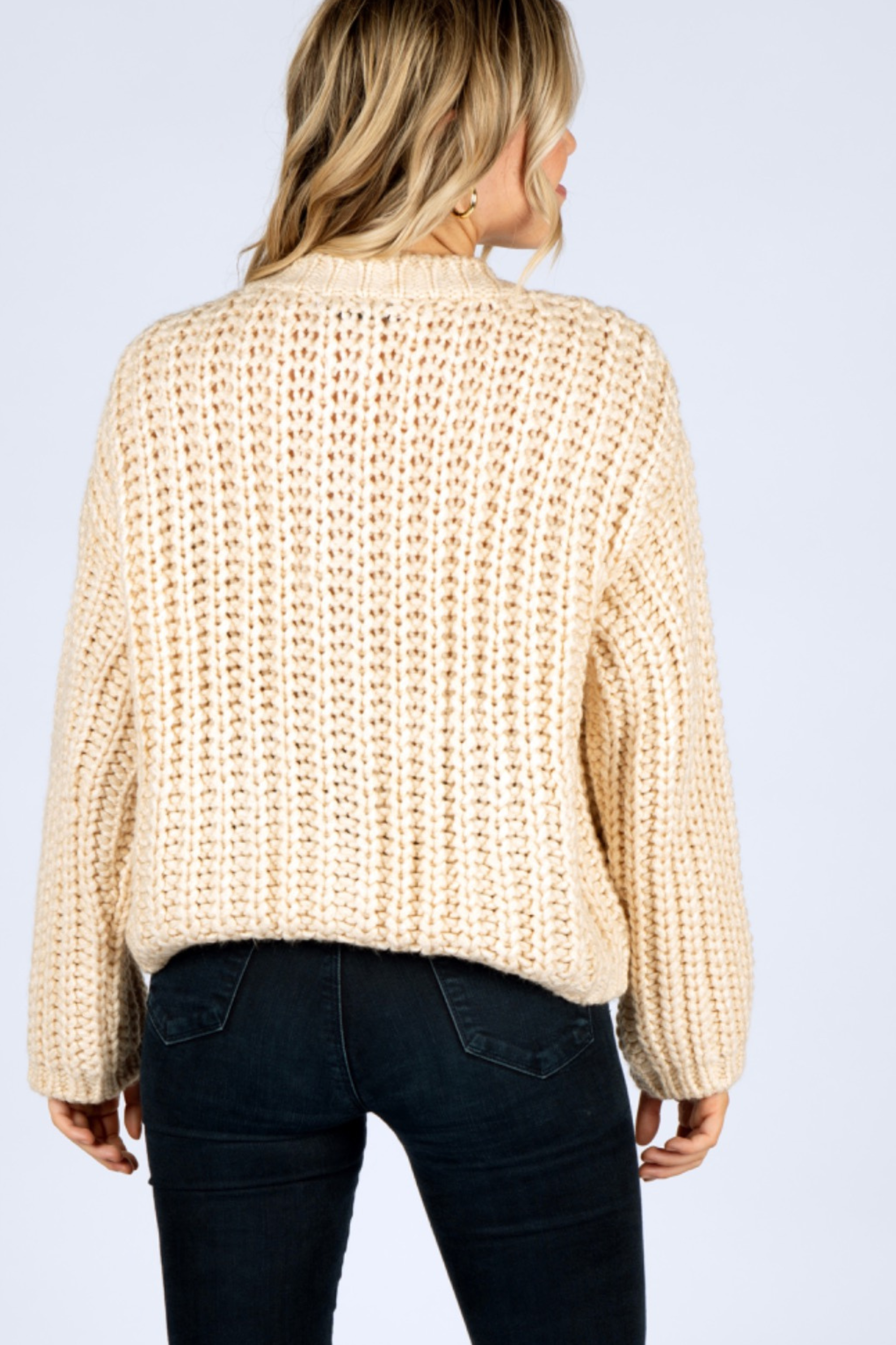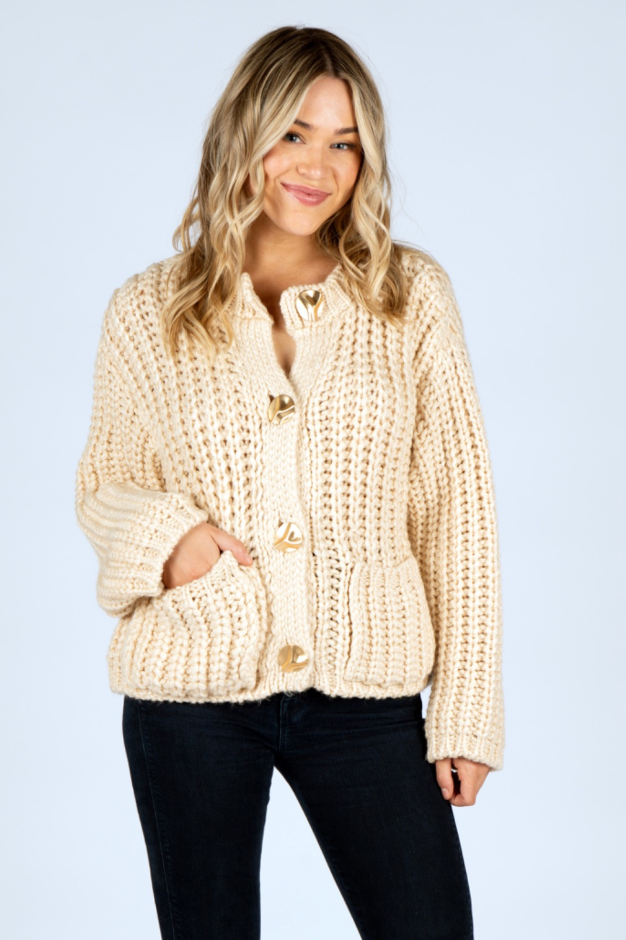 Cozy up this fall with the Zelle Chunky Cardigan in Creme! Featuring eye-catching gold buttons, it’s the perfect layering piece to add warmth and style over your favorite dress. Soft, chunky knit meets playful charm for effortless autumn vibes.