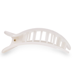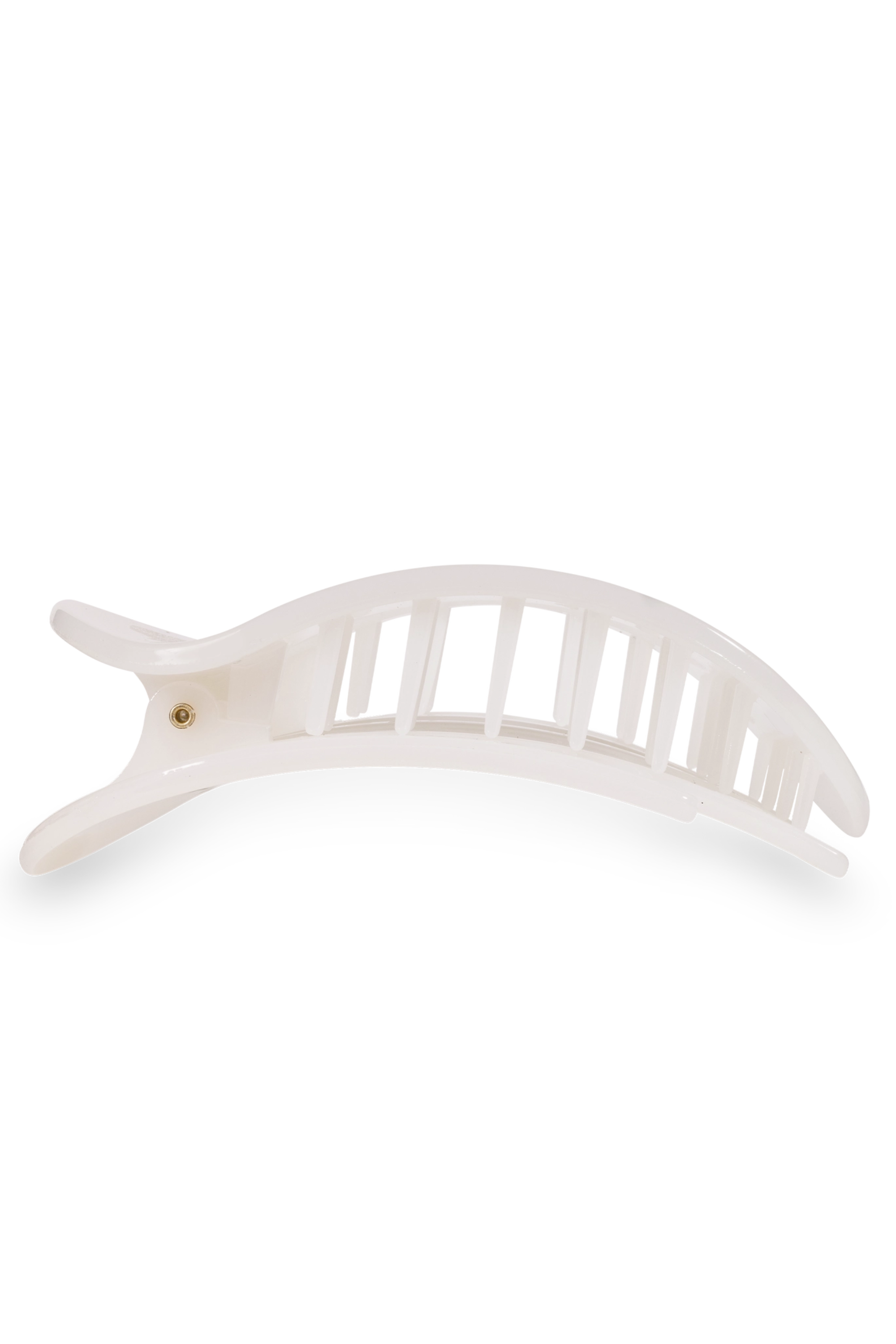 Lay flat and relax with the new TELETIES Medium Flat Round Clip in Coconut White. This hair clip is designed to allow you to lay back flat, do yoga, or sit comfortably in a seat with a headrest, and it is made with the same material that is nearly unbreakable.